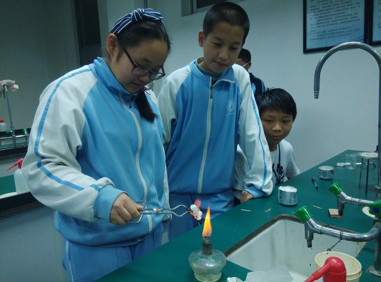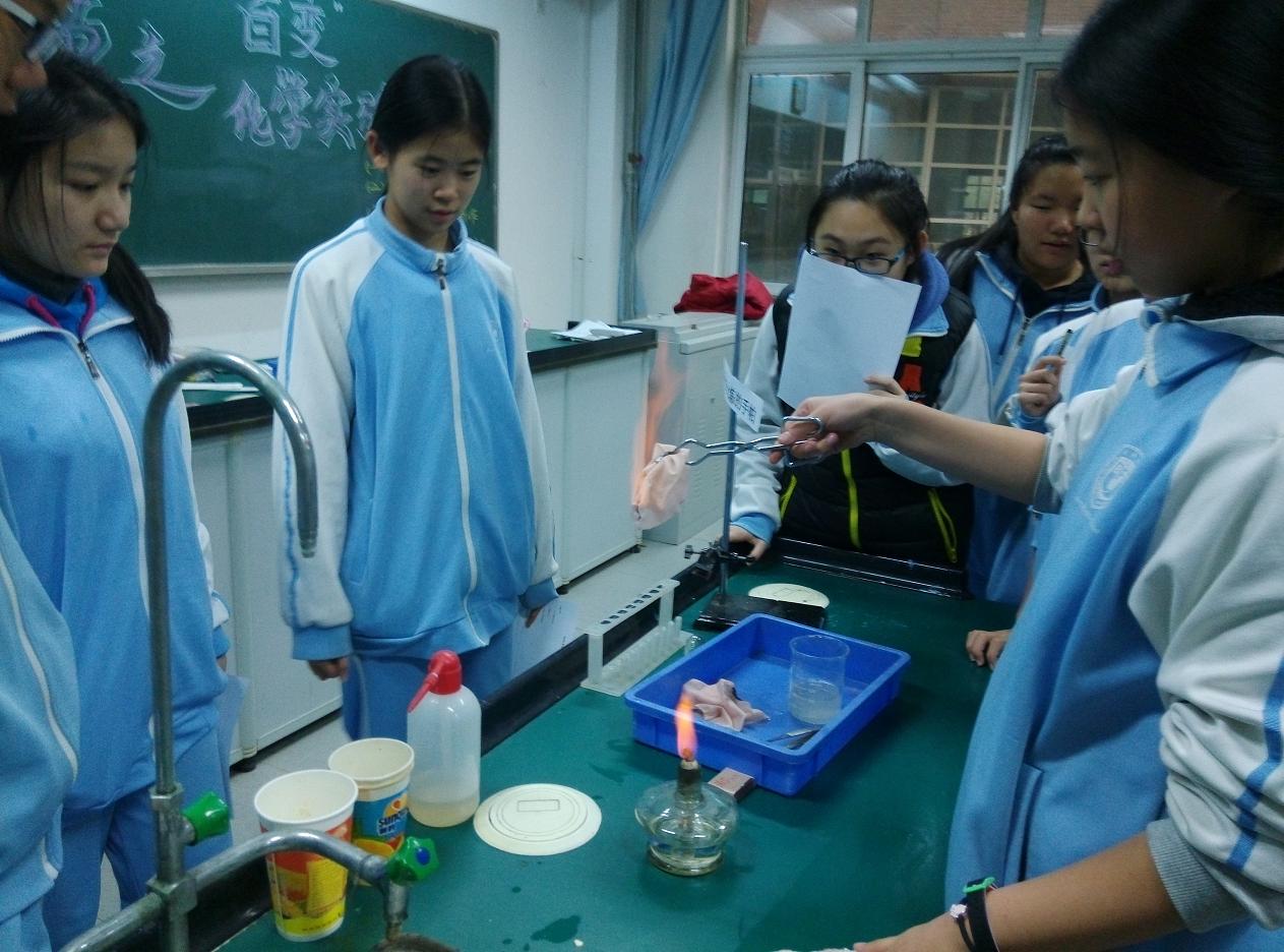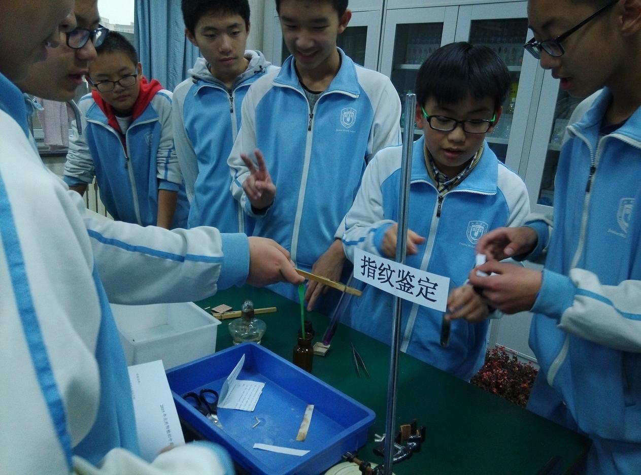 2015年11月16日北外附校初中部科技节拉开了帷幕。19日的中午科技活动之奇妙的化学之旅开始了,当天中午,初一初二的同学在化学实验室里进行了体验活动,化学老师和选修课的同学们给大家准备了五组实验:1、烧不坏的手帕2、指纹鉴定3、汽水的生成4、红酒变白酒5、磨棒点灯。同学们热情高涨,纷纷去体验,乐此不彼,久久不愿离开。