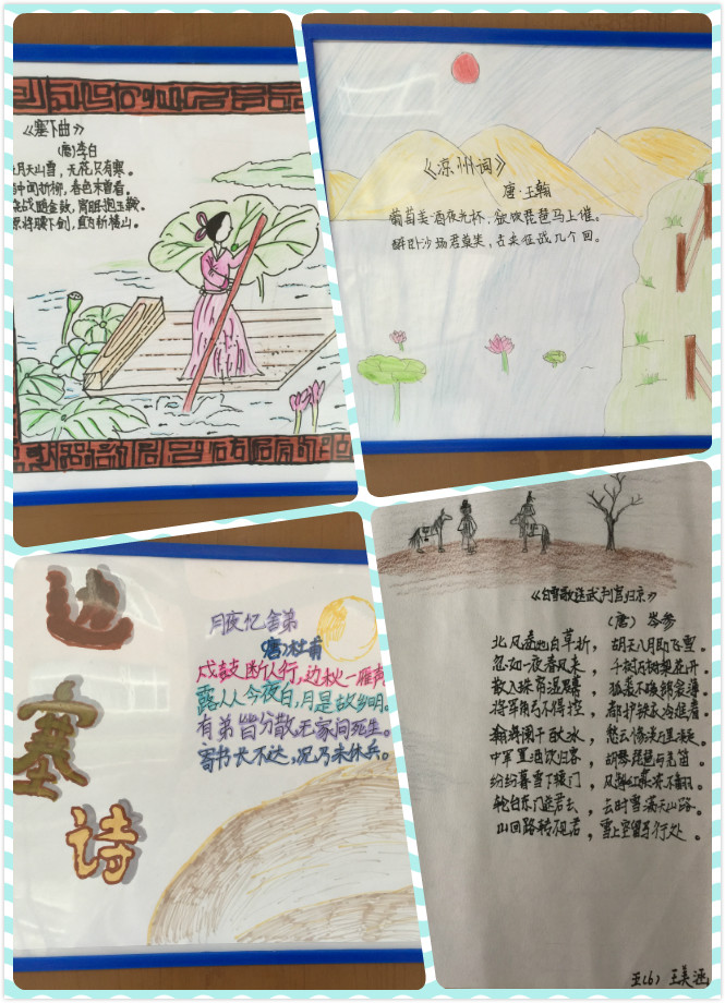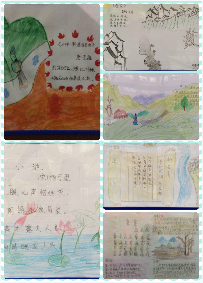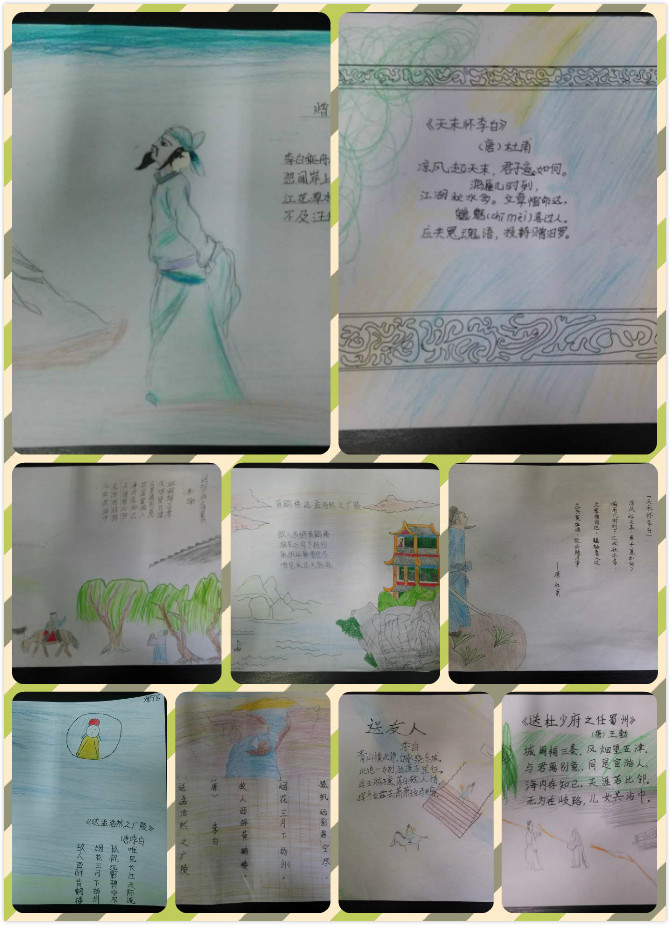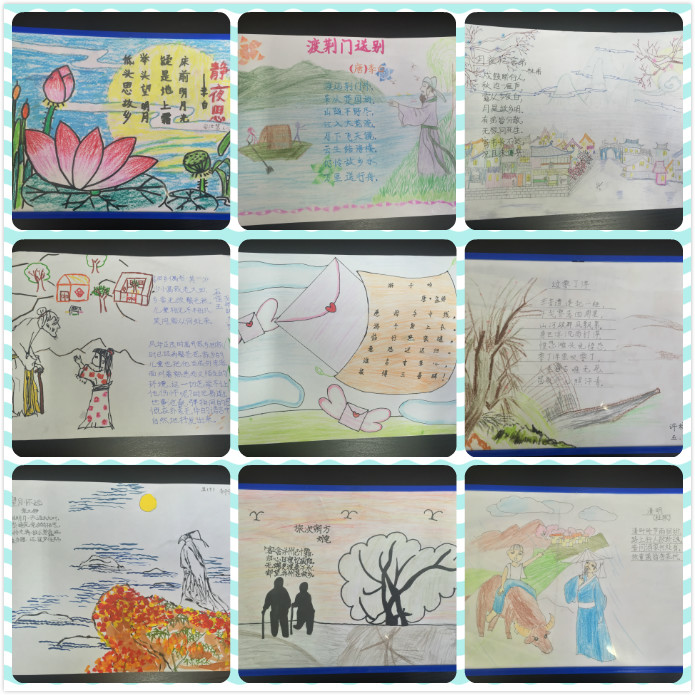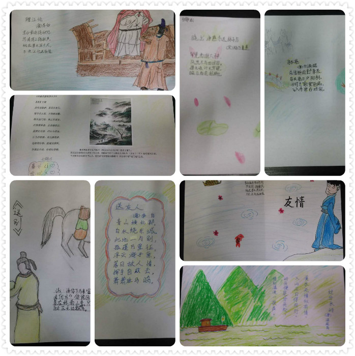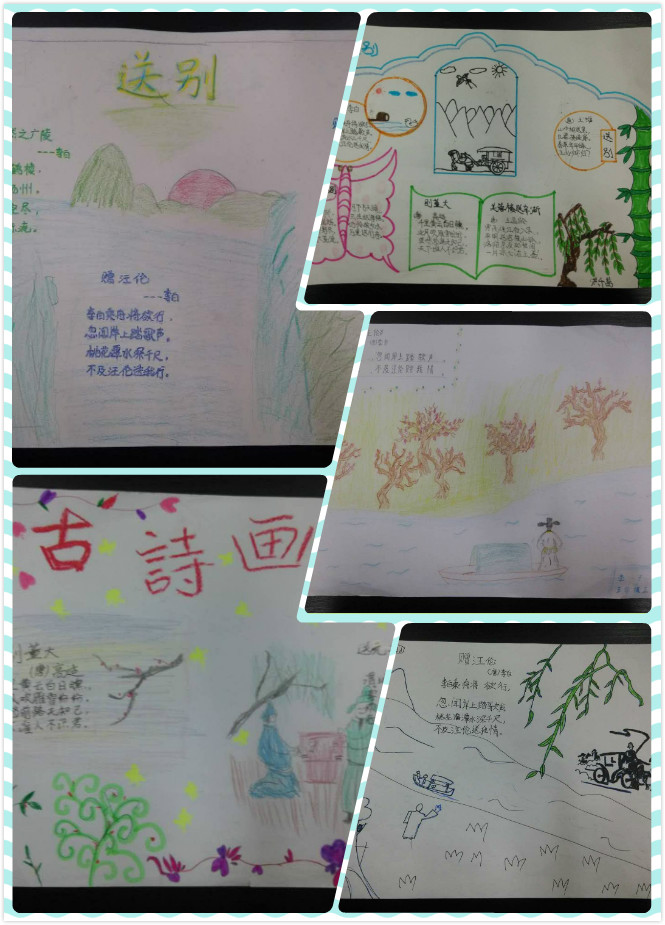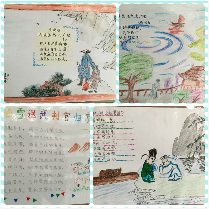 活动中,同学们对自己喜欢的古诗进行精选和分类,配上相应的图画,体现了送别、友情、思乡、山水、边塞等不同主题。画中桃花潭水、海上明月、浮云落日、白鹭桃花……景物与人物、静态与动态互相映衬,完美融合,孩子们用手中的画笔巧妙设计了一张张充满童真和构思独特的诗配画。