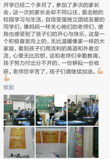 各班家长会,班型不同特色各异,但都是直击学生校园的学习和生活。老师们展示了学生的“亮点”,展示了学生学习的进步状况,展示了学生各种活动的成绩及照片,全面展现了同学们的自信和友爱、自主管理的成就和奋发向上的风采。国际班的外教老师也在家长会上发了言,他们面对家长简介了自己的教学方法,希望自己能为更多的学生提供更好的帮助,希望同学们课上课下都更主动的与外教交流。本班的学生做同步翻译,家长们频频点头,脸上露出欣慰的笑容。许多家长或在教室或到办公室咨询了班主任或科任教师,了解自己孩子的在校具体表现和某一学科的学习情况,尤其对自己孩子的弱科倍加关注,老师们也耐心地为家长“出招”,以诚挚的热心对待每一位家长。