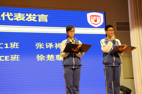 这次会议由来自理(1)班的王露瑄和文(1)班的冯禹铭同学主持。在一段年级风貌展示片后,首先由来自文(1)班和VCE班的学生代表张译禅、徐楚璇发言,分享了各自的学习经验。接着,年级教师代表魏礼元老师分享了管理班级,班级文化建设,学生成长等方面的经验和感悟。之后,年级副主任张国和老师和各位班主任向各位家长通报本学期期中考试、文体活动等表现突出的学生,公布了期中考试优秀奖、进步奖等多项奖项名单,由高二年级任课教师为上台的学生们颁奖。
