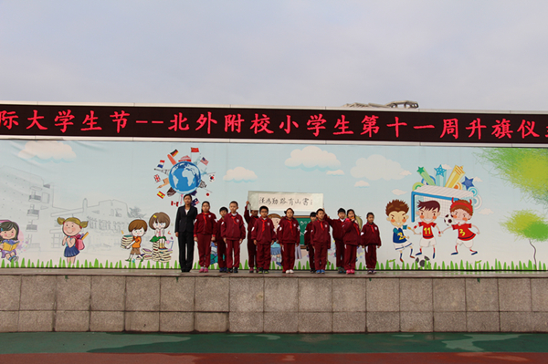 2015年11月16日,我校举行北外附校2015-2016学年度第一学期第11周升旗仪式。在激昂的《义勇军进行曲》中,升旗手振臂一挥,鲜艳的五星红旗徐徐展开,迎风飘扬在上空。小学校长于苒、教学主任李琳、德育处主任孙亚楠、大队辅导员李文霞老师参加了升旗仪式。