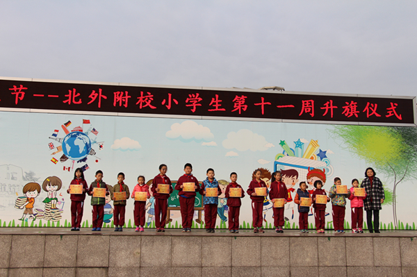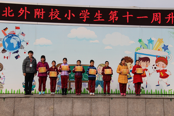 最后小学校长于苒、德育处主任孙亚楠为获奖学生颁奖。小学生第11周升旗仪式顺利结束。