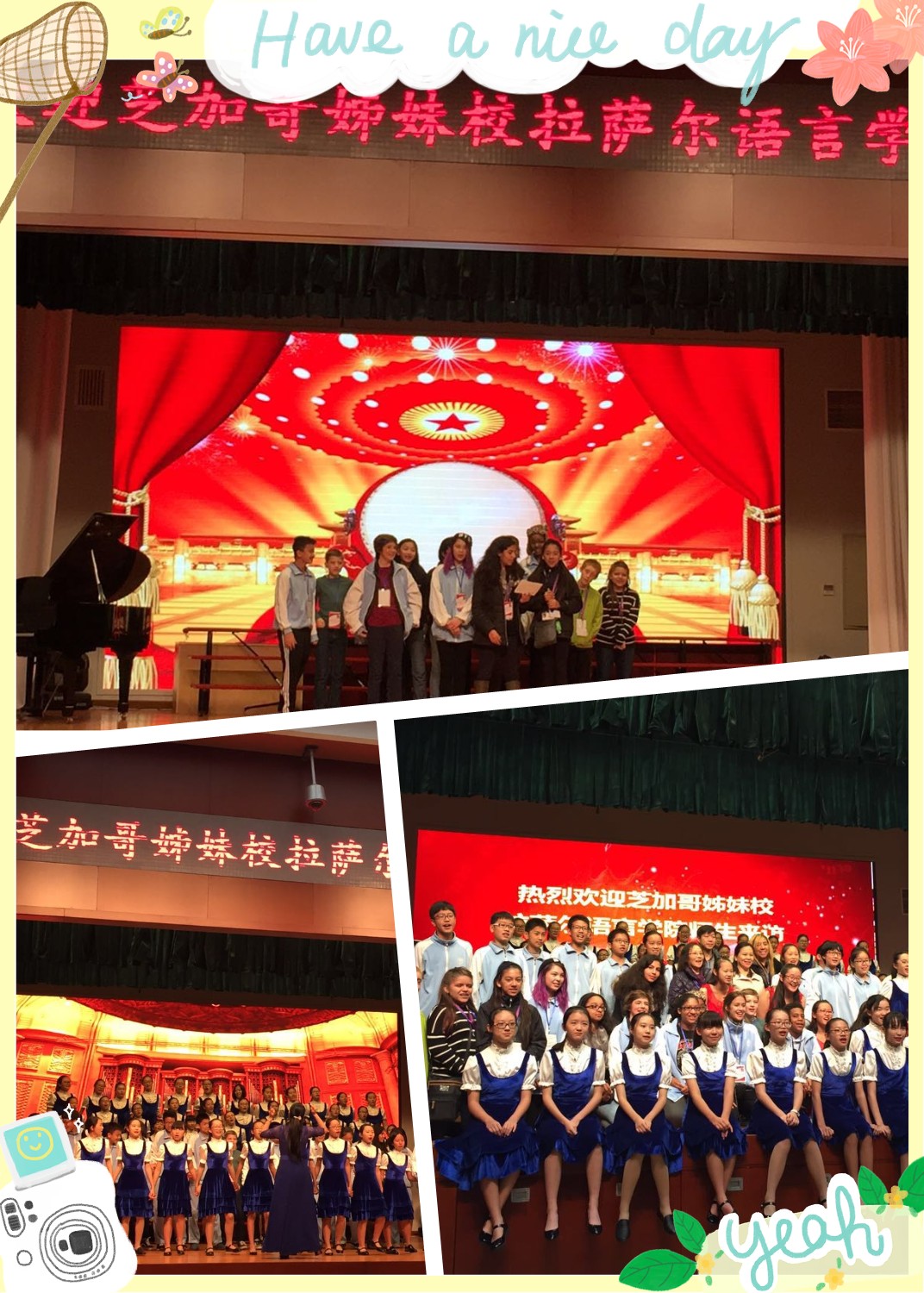 接下来,我校学生精心准备的具有中国传统文化特色的古筝合奏《枉凝眉》、民族乐器五音排鼓演奏《鼓上飞舞》,钢琴小提琴合奏《天空之城》及校合唱团极具水准的合唱《The Rhythm of Life》和《兄弟们在一起》,将欢迎仪式推向高潮。合唱团的孩子们还热情地将来访的师生也邀请到台上一起载歌载舞,气氛十分热烈。