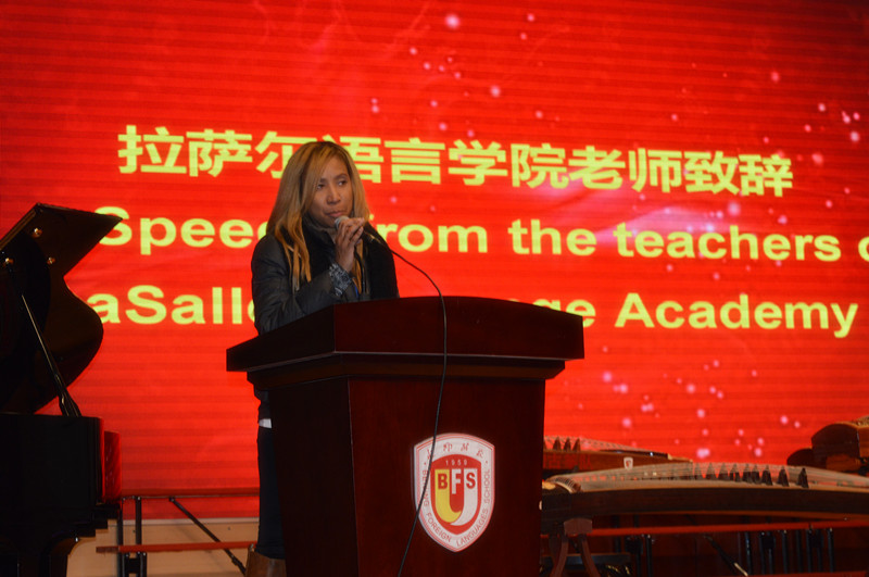 首先,张继军致欢迎辞,对来访师生表示热烈欢迎。张校长指出,双方学校的合作与交流不仅能使学生拓宽视野,了解外国文化,也能使学生在文化交流中不断提升自身素养。张校长希望两校的学生能成为中美友好交流的使者,相互传播两国的优秀文化和精神,在交流的过程中加深了解,共同进步。芝加哥拉萨尔语言学院的三位带队教师纷纷上台发言,对我校的热情欢迎和周到接待表示感谢。张校长和美方代表互赠了校际礼品。