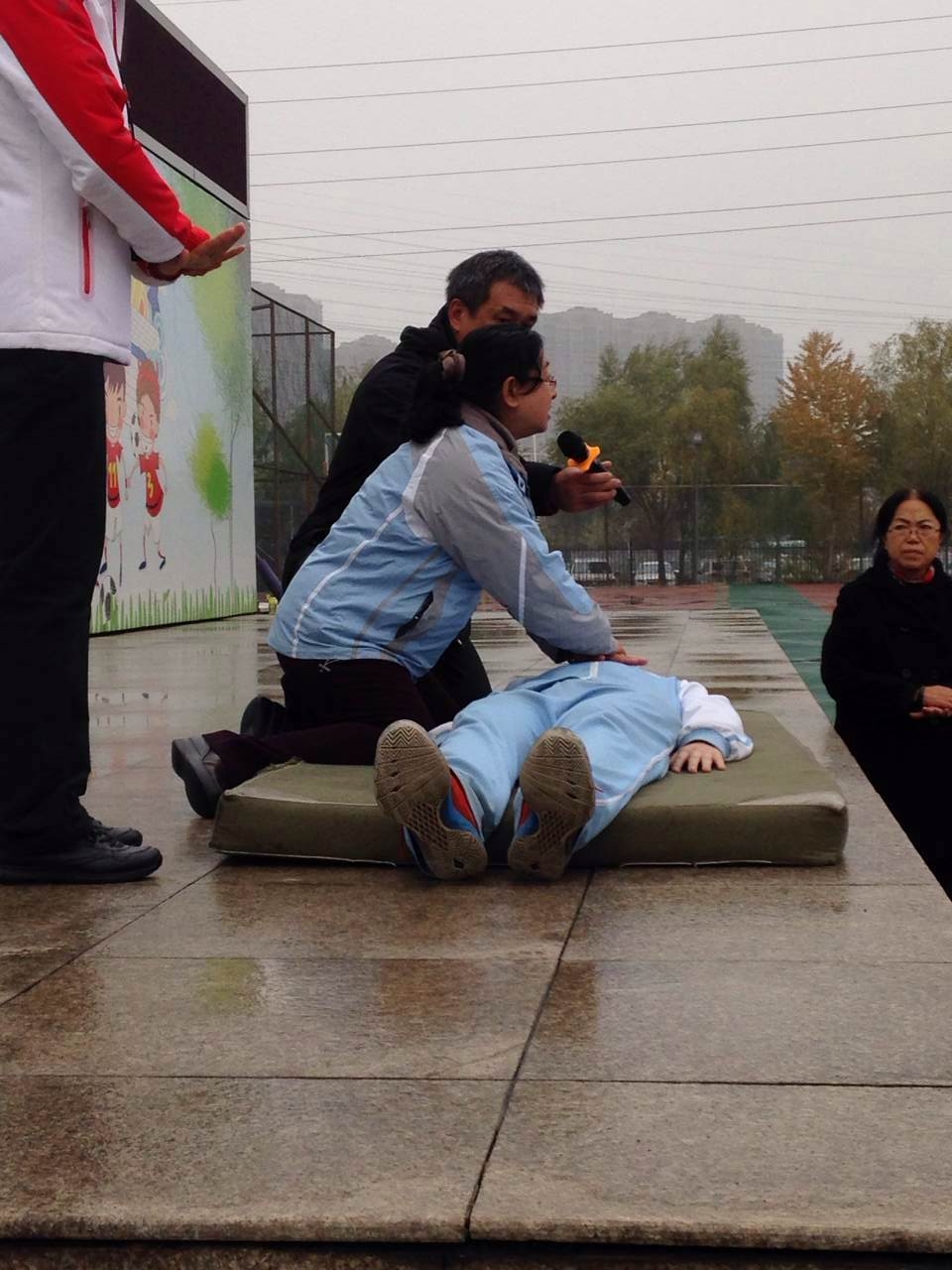 培训活动中,贾大夫先后进行了现代救护、心肺复苏、气道异物梗塞急救、创伤急救等方面的讲座,并进行了模拟急救。心肺复苏急救知识培训中,重点介绍全民掌握心肺复苏的重要性,讲解猝死的症状、抢救时间、心肺复苏的方法,现场模拟示范按压法和口对口呼吸法心肺复苏的操作规范,让师生们了解心肺复苏知识和重要性,掌握心肺复苏的操作流程。现场贾大夫和学生分别模拟医生和患者,用真人示范的方式,让在场的每一位老师生动地体验了解了创伤急救知识,掌握急救的基本方法。