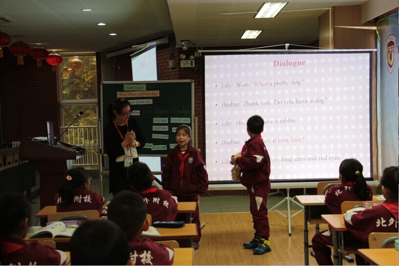 11月12日上午,北师大“彩烛工程”小学校长团一行48人走进了小学校区的英语课堂,观摩了小学三年级组宋花磊老师展示的一节英语会话教学课。北外附校副校长、小学校长于苒全程陪同,教务主任李琳,小学全体英语老师参加了听评课活动。