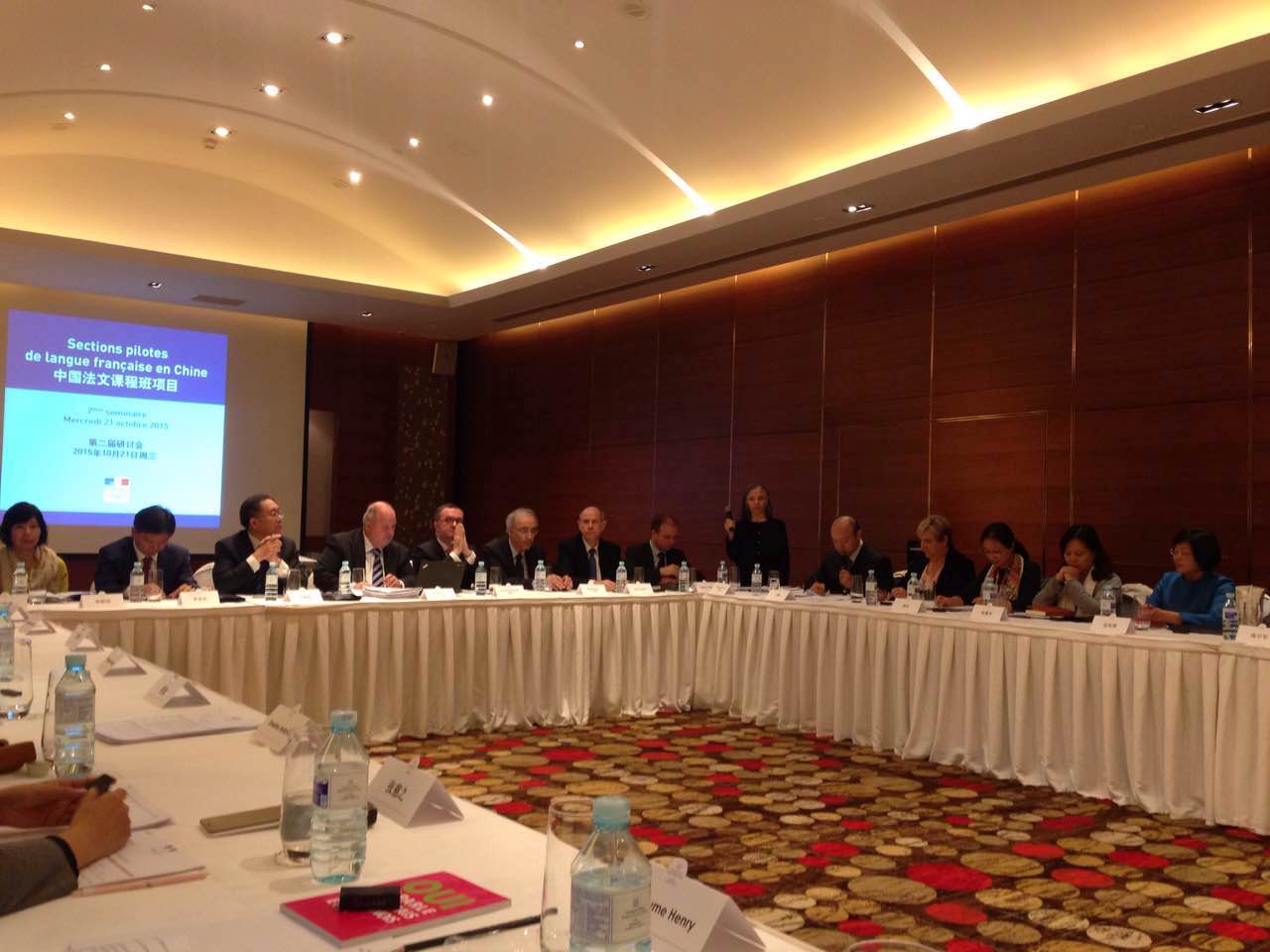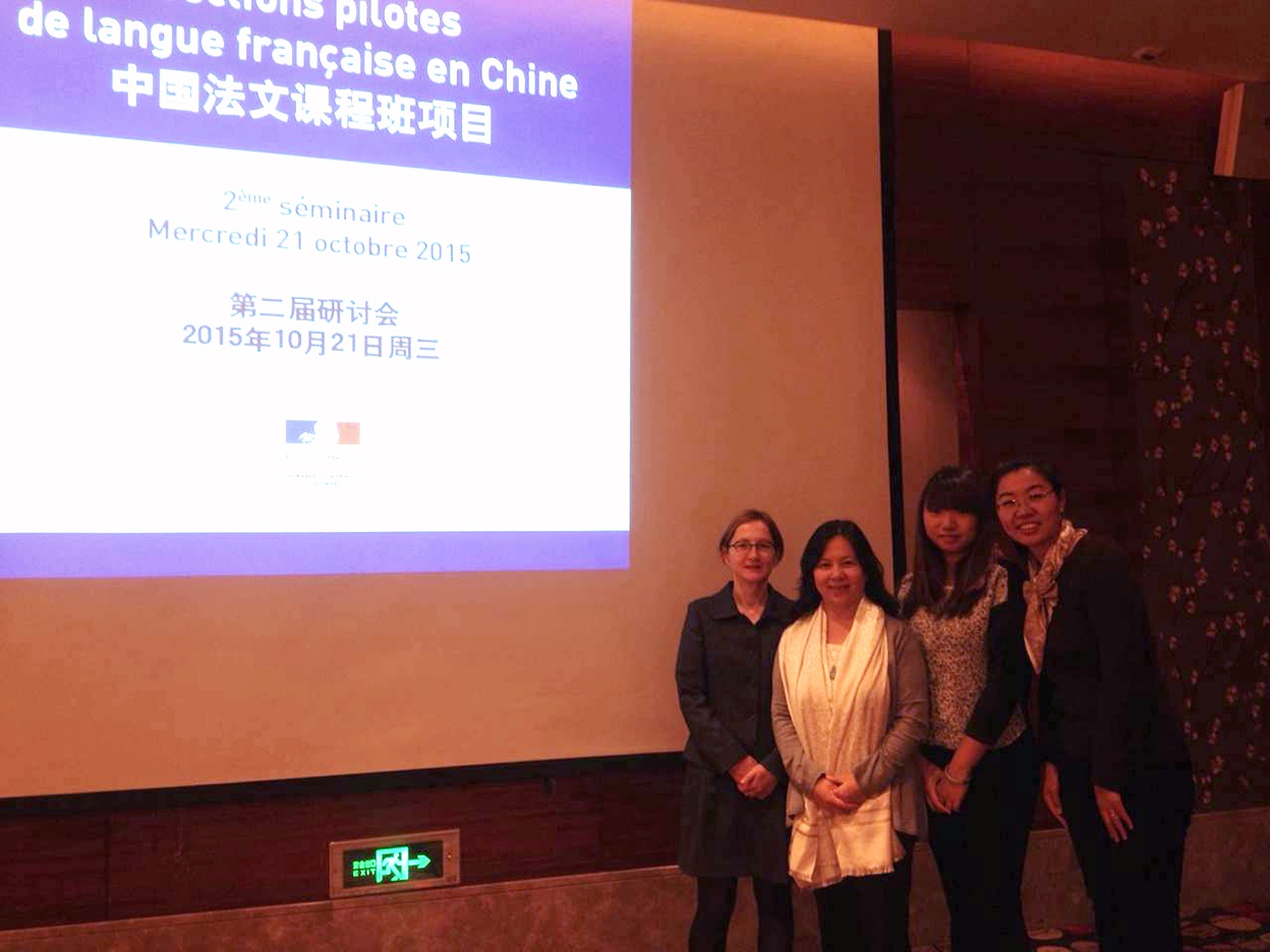 2015年10月21日,第二届“法文课程班”研讨会在北京成功举办,四十多位中外法语教师齐聚一堂。该研讨会由中法两国教育部共同举办,中国教育部国际合作与交流司副司长于继海、法国教育部“法文课程班”项目负责人Gérard-Paul Jeannot先生、法国教育部中文总督学Joël Bellassen先生、法国教育部文学总督学Fabrice Poli先生、数学总督学Erick Roser先生以及来自全国各地外语学校的负责人、法语教师和在华法籍外教出席了当天的研讨会。北外附校副校长张继军及我校法语教研组全体成员参加了此次活动。