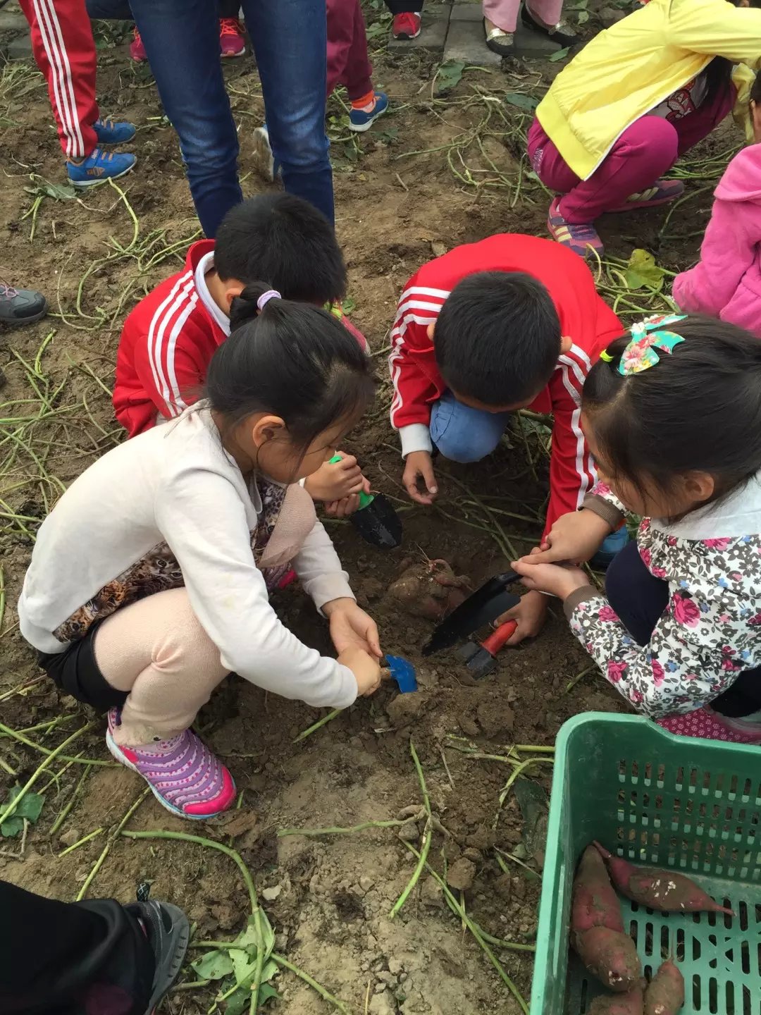 接下来是挖红薯活动,孩子们兴致高昂的用小铲子挖,每个人都很认真,她们先是在地里找薯藤,然后再几个人一起将红薯挖出来.每当有哪组同学挖出一个大大的红薯时,她们就会开心得把红薯举起来,向大家展示自己的劳动成果。孩子们尽情的体会着劳动带来的快乐!