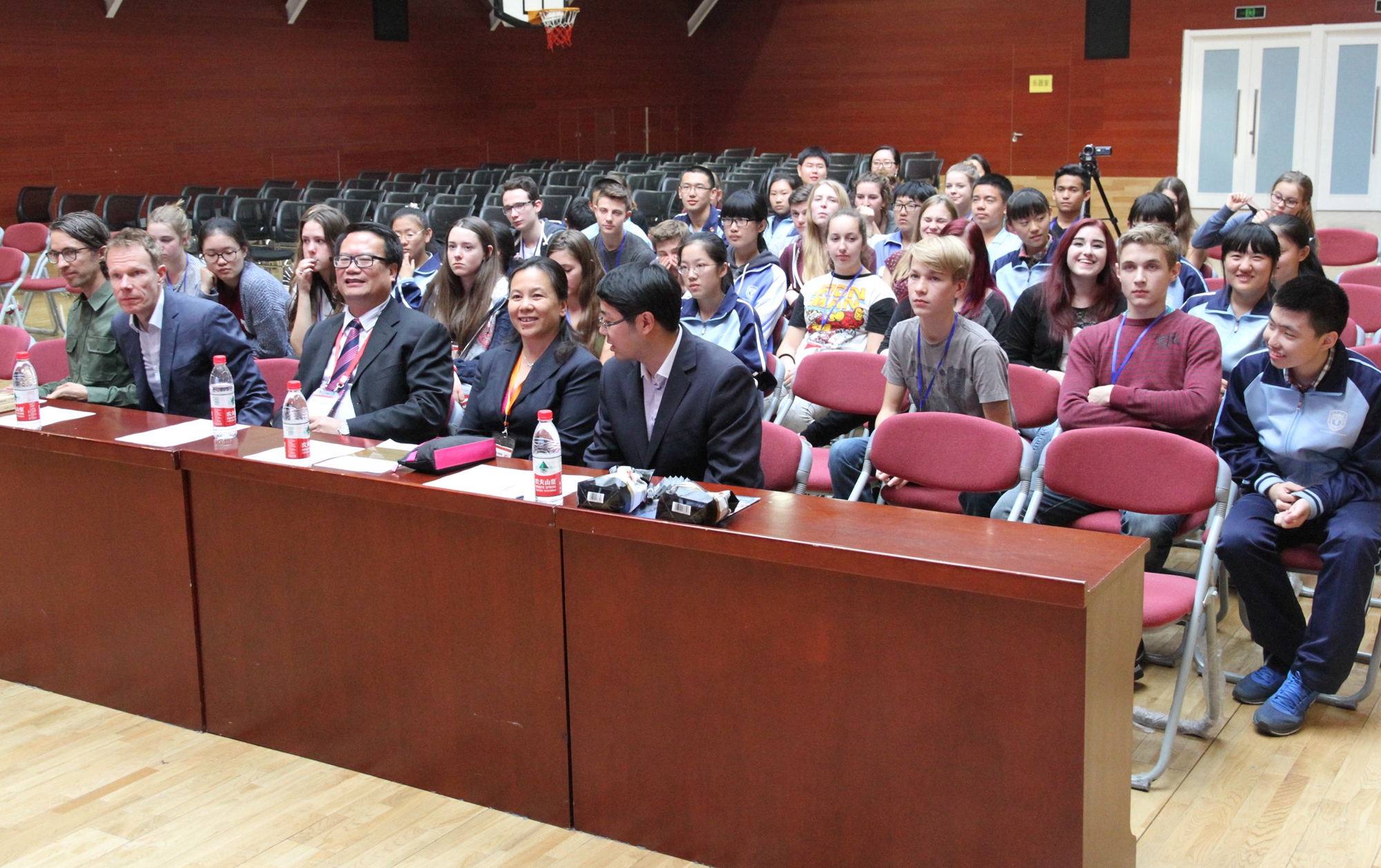 Kreuzgasse中学带队教师Böing先生也进行了发言,对我校的热情接待表示了感谢。他在发言中称,本次已经是他和另一位带队老师Ivanov先生第五次来到我校参加交流项目,因为我们两校之间已经建立了深厚的友谊。同时,他还给我们讲述了他们从德国给我校带来了一棵友谊之树,想要栽种在我校校园中,可惜这棵树最后却没有成功入境。林校长对此深表感动,提议在我校校园内挑选一棵树挂上名牌,作为两校友谊的象征。