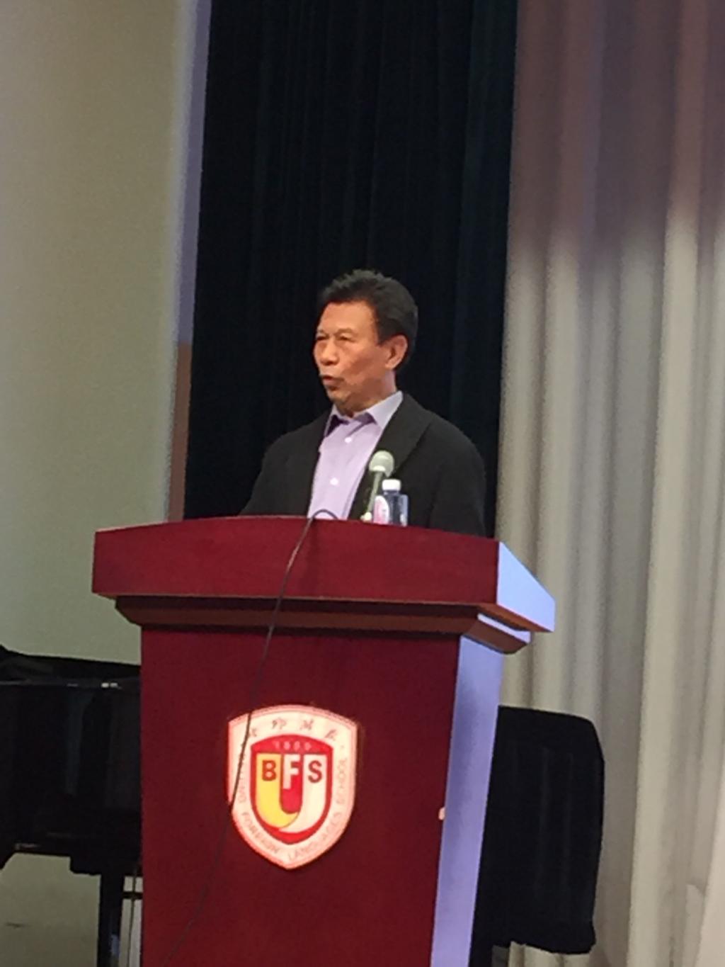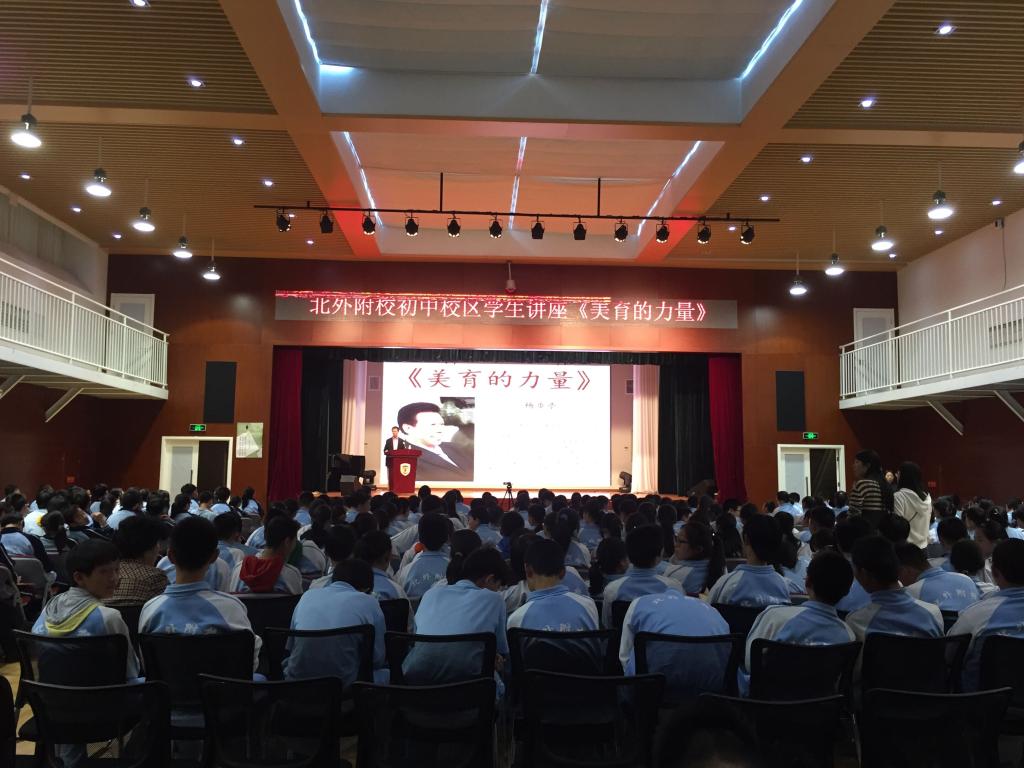 2015年10月12日下午八、九节课,初中校区特邀学校艺术活动研究与指导中心顾问杨步亭先生莅临国瑞厅,为初二、初三年级全体学生做了题为“美育的力量”的讲座。此次讲座由初中校长助理许祥老师主持。