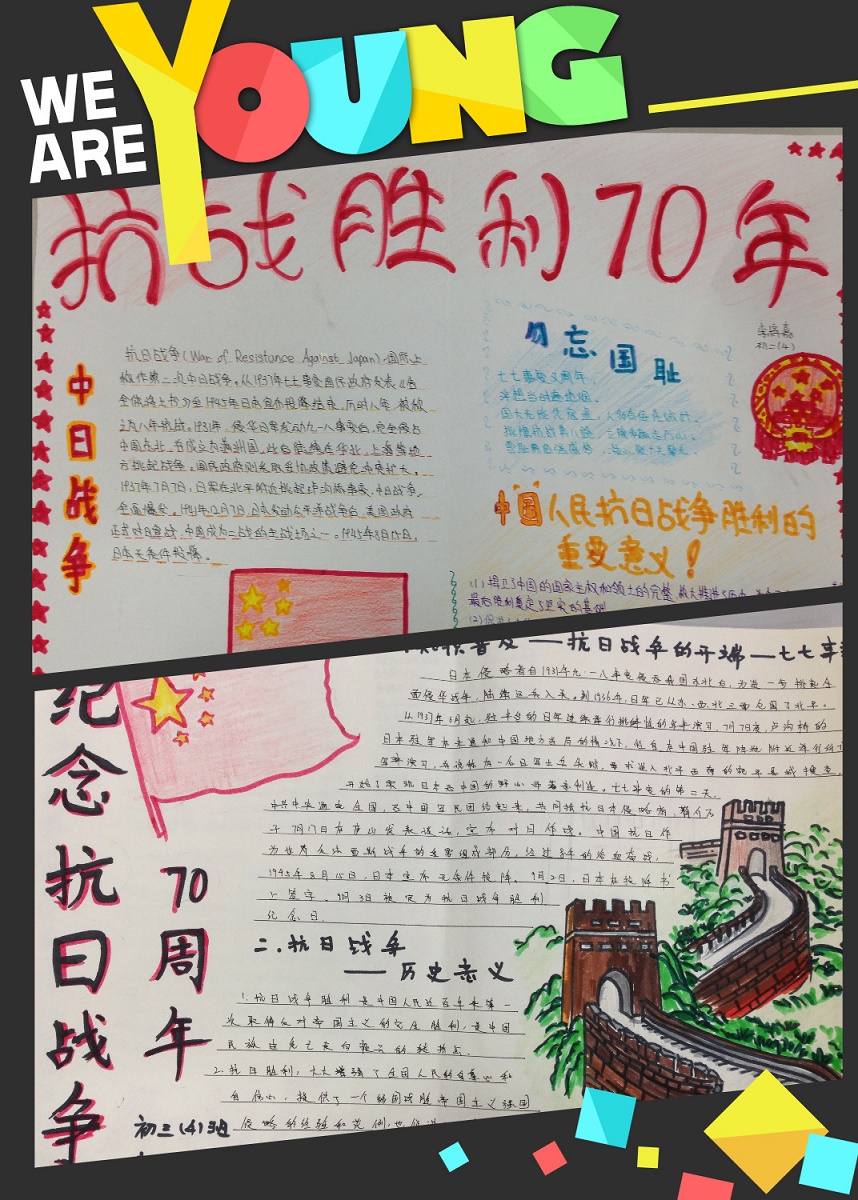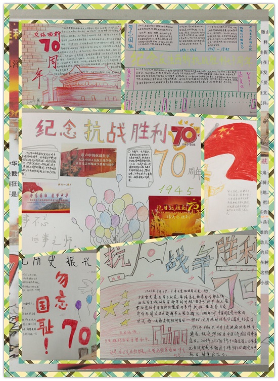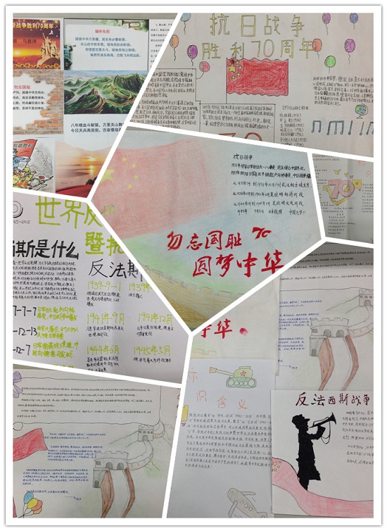 学科活动以演讲、征文、学科小报等多种形式展开。学生深刻体会缅怀抗日先烈,歌颂各族人民英勇抗战的不屈精神。同学们的演讲,深切地表达了他们的爱国情怀和对祖国抗日英雄的敬爱之情。在活动过程中学生们深切感受到祖国的今天是无数先烈用他们的生命换来了我们现在来之不易的幸福生活,我们会倍加珍惜,用实际行动回报我们伟大的祖国,为中华民族的伟大复兴、为中国梦的早日实现,而刻苦学习。”
