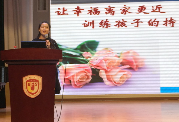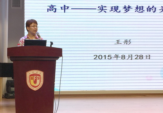 下午3点半,新高一入学教育大会在国瑞厅如期举行。首先,常务副校长王彤为新生们做了主题为《高中——实现梦想的关键一步》的讲话。王彤先为在座的同学介绍了北外附校的历史和现状,多语种教学以及学校的荣誉,为同学们解读了校训“兼容并蓄,博学笃行”的深刻含义,她让同学们思考了高中入学前的四个问题,即:“我的梦想是什么?我的高中起点是什么?2-3年后我要去哪里?我的高中计划是什么?”王彤还为同学们举出了一些著名的研究实验,说明在未来人生的路上,实现梦想到底需要什么样的品质。她还希望家长们能够做到“陪伴、示范、引领”的作用,因为这将是家长能够影响孩子、呵护孩子的关键时期。王彤的讲话,以丘吉尔的一句名言:“Never ever ever ever give up!”(永远永远永远永远不要放弃!)作为结束。