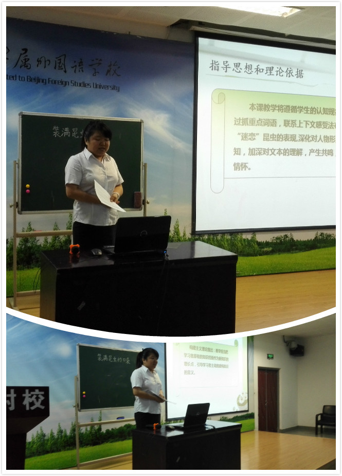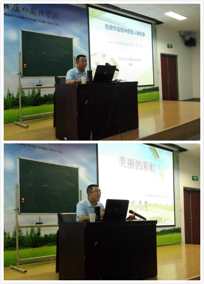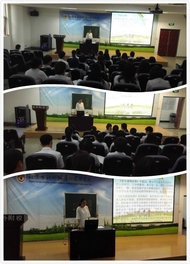 会议伊始一年级组的冯帆老师首先拉开序幕,以《美丽的彩虹》为题进行了说课。冯老师年轻富有活力,设计环节紧抓字词教学,紧抓“戴”字做文章,通过理解戴字——拓展组词——句子仿说三个环节将项链与彩虹有效链接突破难点,最终引导学生体会彩虹的美。三年级韩雪老师则以抓住人物细节描写为题对《装满昆虫的口袋》这篇课文进行了说课。韩老师沉稳大气,从抓时间、抓修辞、抓语言等6个方面引导学生体会法布尔对昆虫的迷恋,最终引导孩子学习通过典型事例凸现人物形象的写作手法,并将语、动、心、神的描写润物细无声地渗透到教学环节中,为中年级向高年级的发展过渡做好了铺垫。两位老师按照说课具体环节呈现了自己的说课设计,各具特点得到了黄老师的充分肯定。