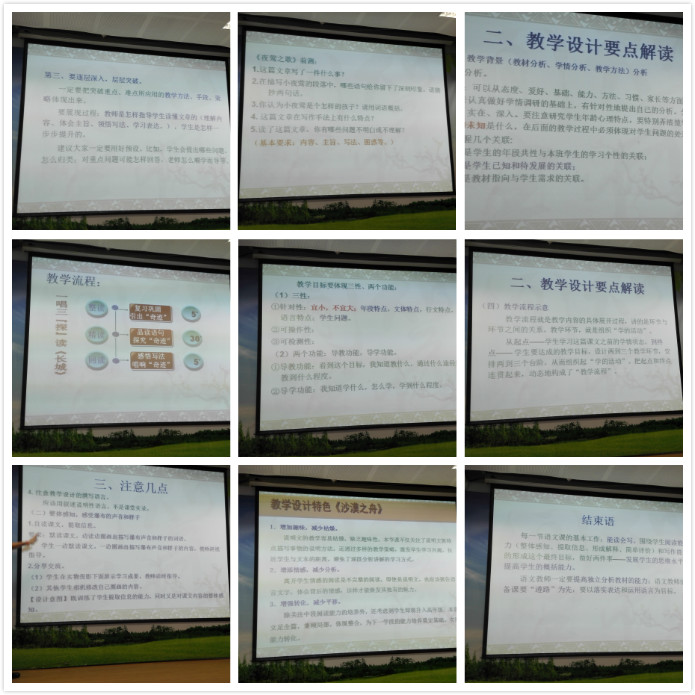 抛砖总是为了引玉。随后黄毅老师针对如何撰写教学设计进行持续两个半小时的专题讲座。他从指导思想和理论依据、教学背景分析、教学目标、教学流程示意图、教学过程、学习效果评价设计以及教学设计特点这七个方面进行了详细地讲解。其中,他特别强调,一份好的教学设计,必须要有一个详细的教材分析,要求教师体现出年段特点及文体特点,设计具有准确性和独创性。此外,教学目标的设定也非常重要,它是整堂课的灵魂,设计要有针对性、可操作性和可检测性。会议最后他还谈到:“每一节语文课的基本工作就是要达到让学生能读会写。围绕学生阅读能力(整体感知、提取信息、形成解释、简单评价)和写作能力的形成这个最终目标,做好两件事——发展学生的思维水平,提高学生的概括能力。语文教师一定要提高独立分析教材的能力并且备课要“遵路”为先,要以落实表达和运用语言为目标。