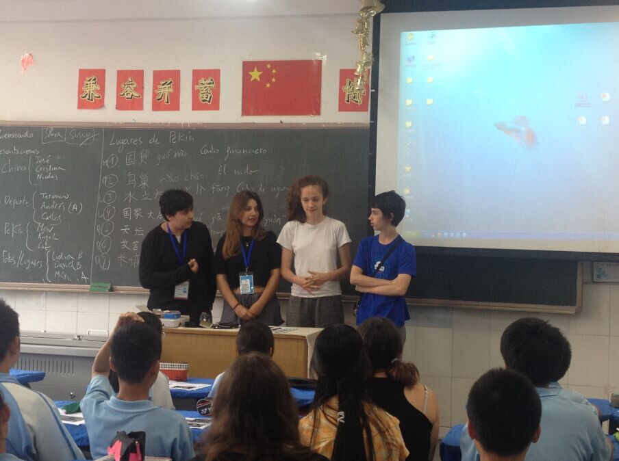 在一个风和日丽的下午,来我校参加西语交流活动的西班牙姊妹校学生来到初一五班教室,聆听由初一五班同学和西语老师一同精心准备策划的公开课。在这节公开课上,我们的主题是主要是关于北京,中国和我及我校校课程表的介绍与交流。