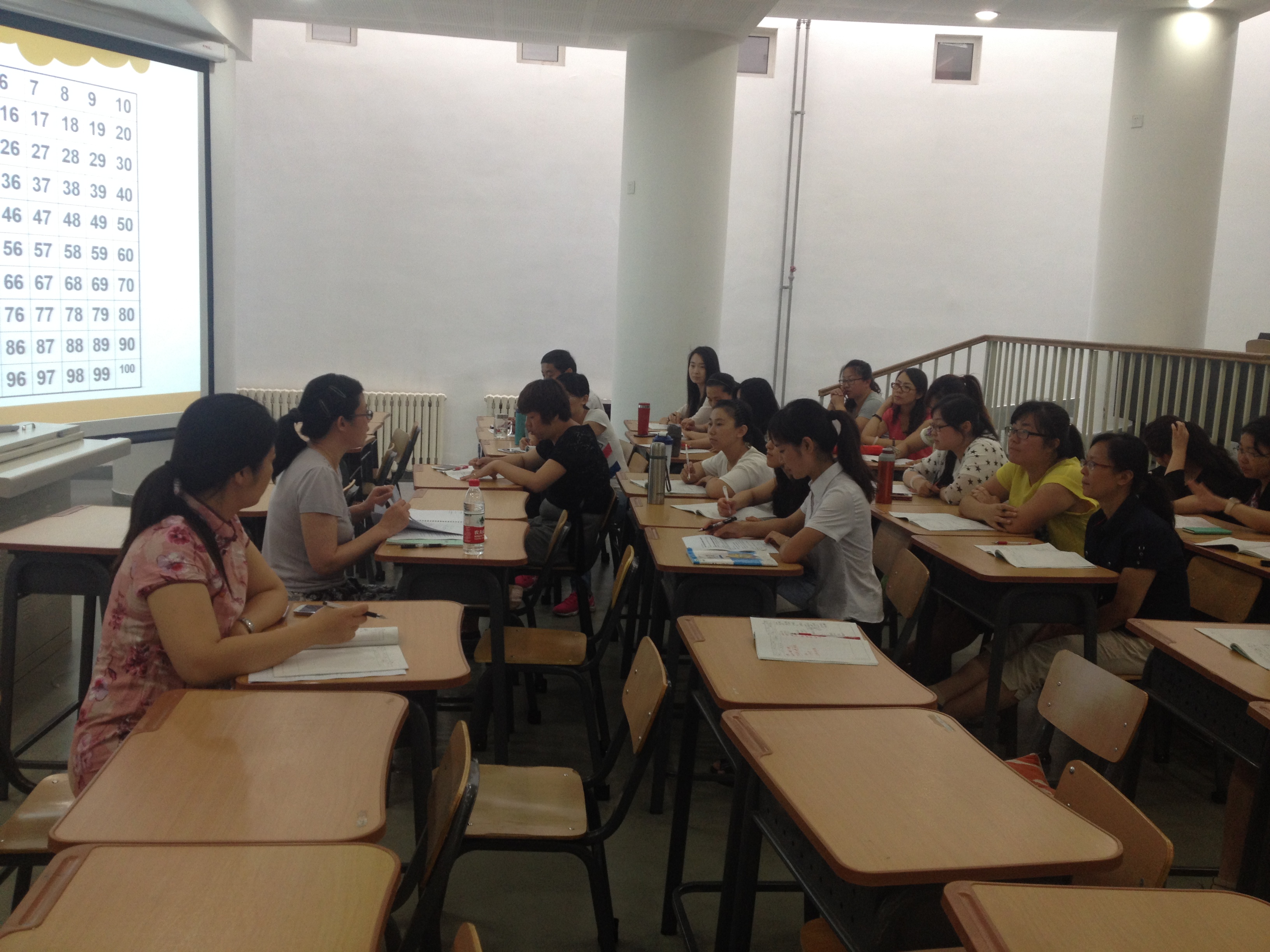 领导们和小学数学组的教师们济济一堂,一起听了由焦顺飞老师展示的一堂《百数表》,焦老师首先以猜谜的方式导入,调动起学生们探索的积极性。教学的过程中,焦老师大胆的放手,给学生们大量的时间和空间,让学生们自由的想象;在活动中搭建平台,鼓励学生与学生之间进行对话,进行思维上的碰撞。