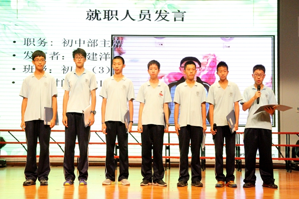 首先,主持人袁赫闱与陈正阳宣读新一届领导团队及全体工作成员名单,邀请宿管中心学委会主席郑昊南作学委会简介、建立目的与阶段性目标介绍。学委会新一届领导团队成员袁赫闱、陈逍遥、肖建洋、史嘉威、庄智炜、陈正阳和王佳淇也分别进行了就职演讲。紧接着便是学委会领导团队代表陈逍遥的工作感悟交流以及初一优秀宿舍长代表孔祥睿的发言。