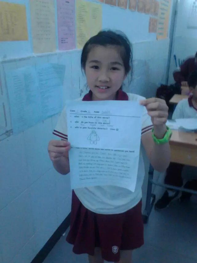 当天,同学们围绕了电影的主人公和部分台词、情节等进行讨论,写出了自己喜欢的英文句子,并模仿剧中人物大声读出了句子。同学们还一起探索了电影的主题和中心思想,讨论其中蕴含的哲理对我们现实生活的意义,英语教师也加入到大家的讨论中,场面热闹非凡。讨论最热烈的就是针对自己最喜欢的人物进行评论,大部分同学选择的是大白,并画出了大白这个人物,同学们用英文发表了自己对大白不同的看法,最后老师从精神层面总结分析,希望同学们将情感和渴望投射到对大白的喜爱上,鼓励同学们好好学习大白,做大白那样宽容,关爱别人并能够给别人带来温暖的人。