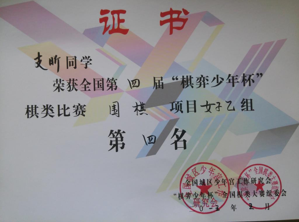 我校五年8班支昕同学在全国第四届“棋艺少年杯”围棋比赛中获得女子乙组第四名,为我校争得了荣誉。支昕同学还是校围棋队主力队员,校围棋队每周四中午在王启泰老师带领下在围棋教室训练,另外欢迎三、四、五、六年级高段同学加入我校围棋队。