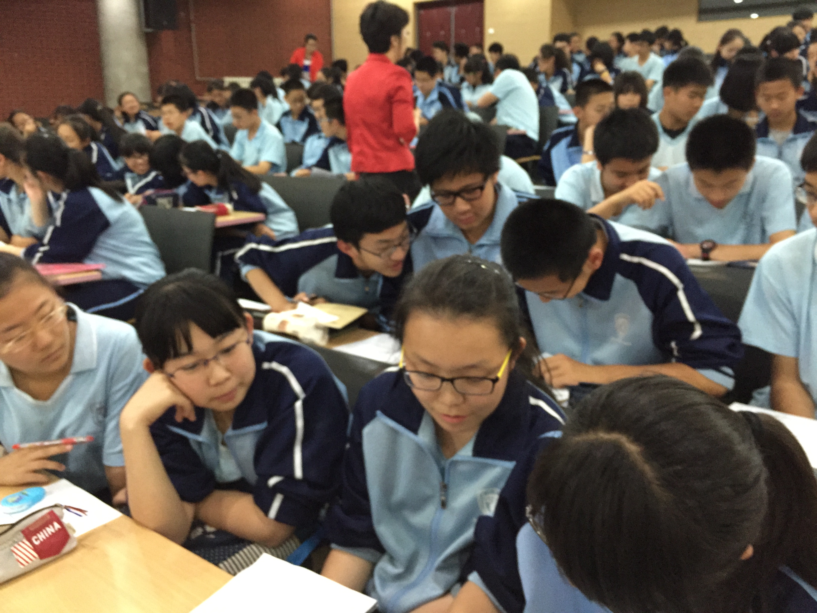 曹教授是英国曼彻斯特大学硕士、英国诺丁汉大学博士、北京外国语大学国际教育学院院长、北京外国语大学青少英语首席教学顾问、北京外国语大学PASS(Program for Academic Success)留学基地教学顾问。为更好地向初中学生介绍英语阅读的益处和正确的方法,讲座之前曹教授为每个学生和小组准备了讲义。在讲座中,她以哥伦比亚大学入学申请中对于阅读的严格要求开场,之后,她又现身说法,介绍自己儿子8岁开始的英语阅读经历和现在的收获,向同学们展示了英语自由阅读对语言学习产生的意想不到的惊人效果。长达一个多小时的讲座中,她妙语连珠,实例丰富,同时配以小组活动的形式,调动在场每一位同学的积极性,与师生分享阅读的作用、阅读的方法、英语读物的选择等。讲座结束后,曹教授和初中英语教师就英语阅读教学进行了深入的交流。