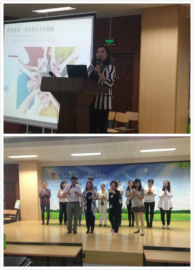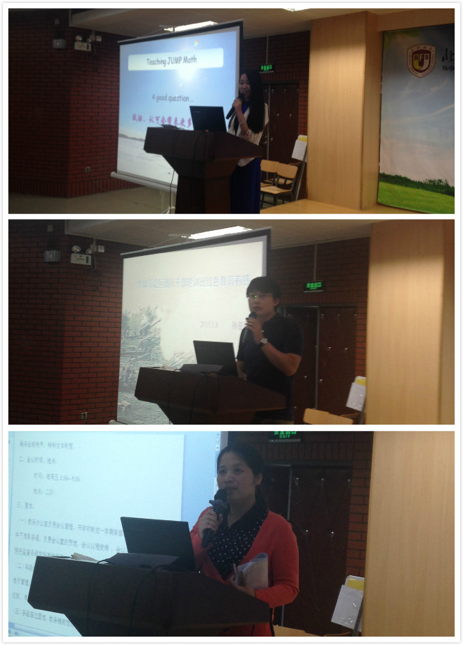 首先,英语组分享了多方“取经”归来之后的收获与感悟,这也是本次会议的亮点。英语教师团队以沙龙的形式,轻松、诙谐地再现了外出学习的点滴收获,激励教师要不断学习新理念、新方法,深入了解学生,钻研教材教法,不断提升自己的教育教学教研水平,获得了参会教师的好评。为提高教师教学水平,学校领导积极搭建平台,创造学习交流机会。经多方协调,我校英语团队获得了参加高水平研讨会的机会,我校副校长于苒带领贾科君和刘佳赴武汉参加2015外研社《剑桥国际少儿英语》联合师训会;小学副校长郭丽丽带领郭敏玲和田兆赴沈阳参加KB师训会;英语教研组长刘蕾和曲阳赴成都参加KB研讨会;英语教研组长宋花磊和苏洁、雍文娟参加了北京海淀外国语学校的研究课学习,等等。这些活动的开展,不仅使老师们学习了解了更为科学的教学理论和教学方法,同时也为小学部的外语特色办学注入了新的活力。