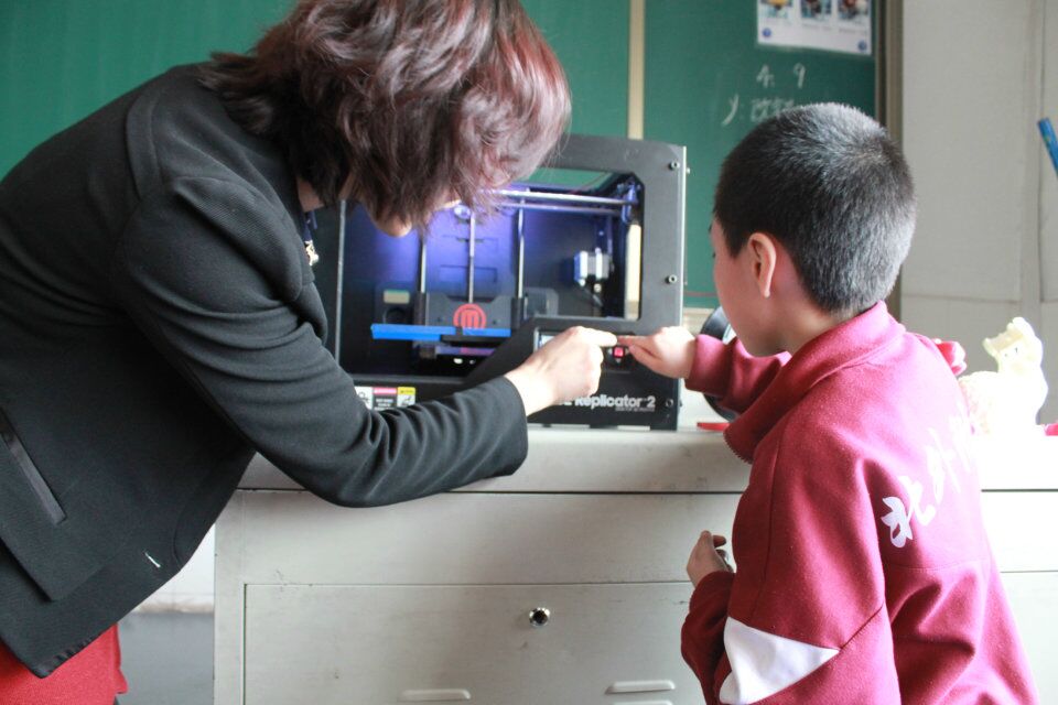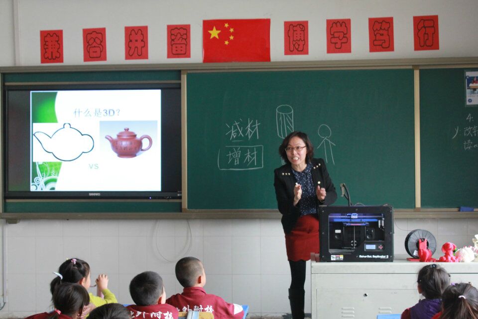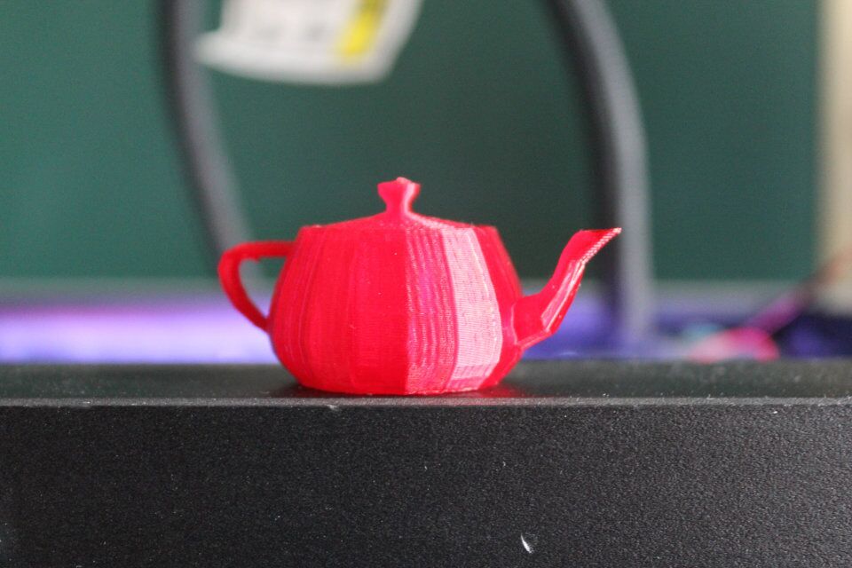 当孩子们亲手将红色开关按钮按下后,便目不转睛地盯着这台微波炉大小的打印机,只见红色的塑料线从打印机入口经过高温挤压,变成一根根细线后又经过不断叠加,一个栩栩如生的茶壶模型逐渐形成,而这些都是通过一台3D打印机完成的。