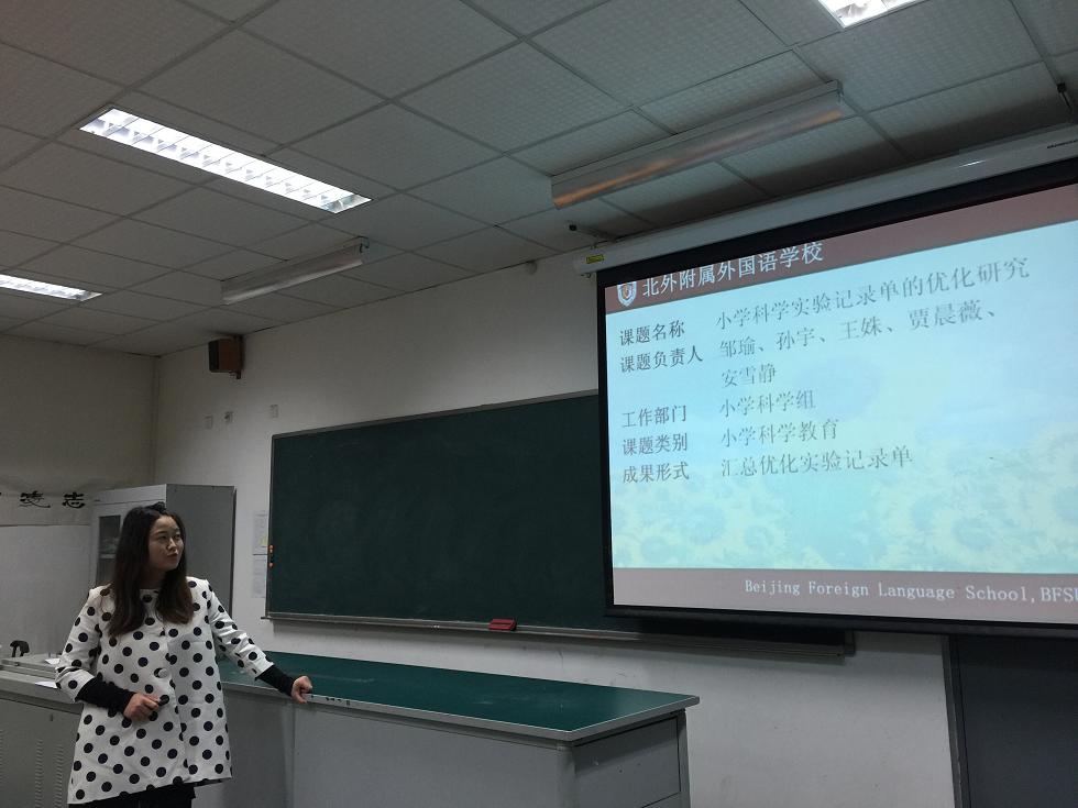 科学组承担的校级课题为《小学科学实验记录单的优化研究》,课题核心组成员为王姝、邹瑜、孙宇、贾晨薇、安雪静5位老师。会上,王姝汇报了课题的研究方向、研究方法、研究对象、预期成果及工作进度,并对小组成员的分工进行了细化和明确。她指出,该课题涉及范围广,历时长,任务重,每位小组成员都要认真负责地完成自己的任务,同时要随时进行交流讨论,确保课题研究顺利进行。