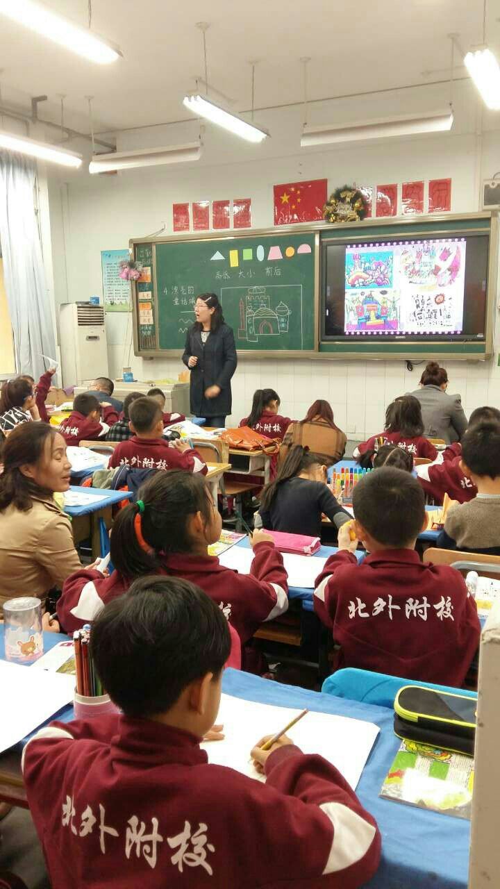 3月31日,上午第四节,我在小学部一年级二班讲授了一节美术家长开放课《漂亮的童话城堡》,美术组老师参加了听评课活动。《漂亮的童话城堡》是一年级美术下册中的一节绘画课,属于“造型•表现”领域。本课以童话城堡为造型主题,非常符合低年级学生的兴趣和年龄特点。