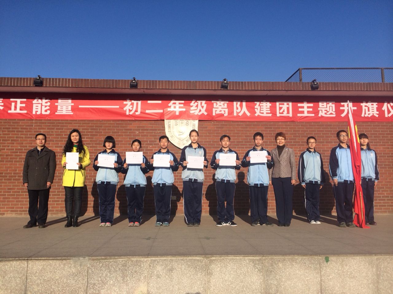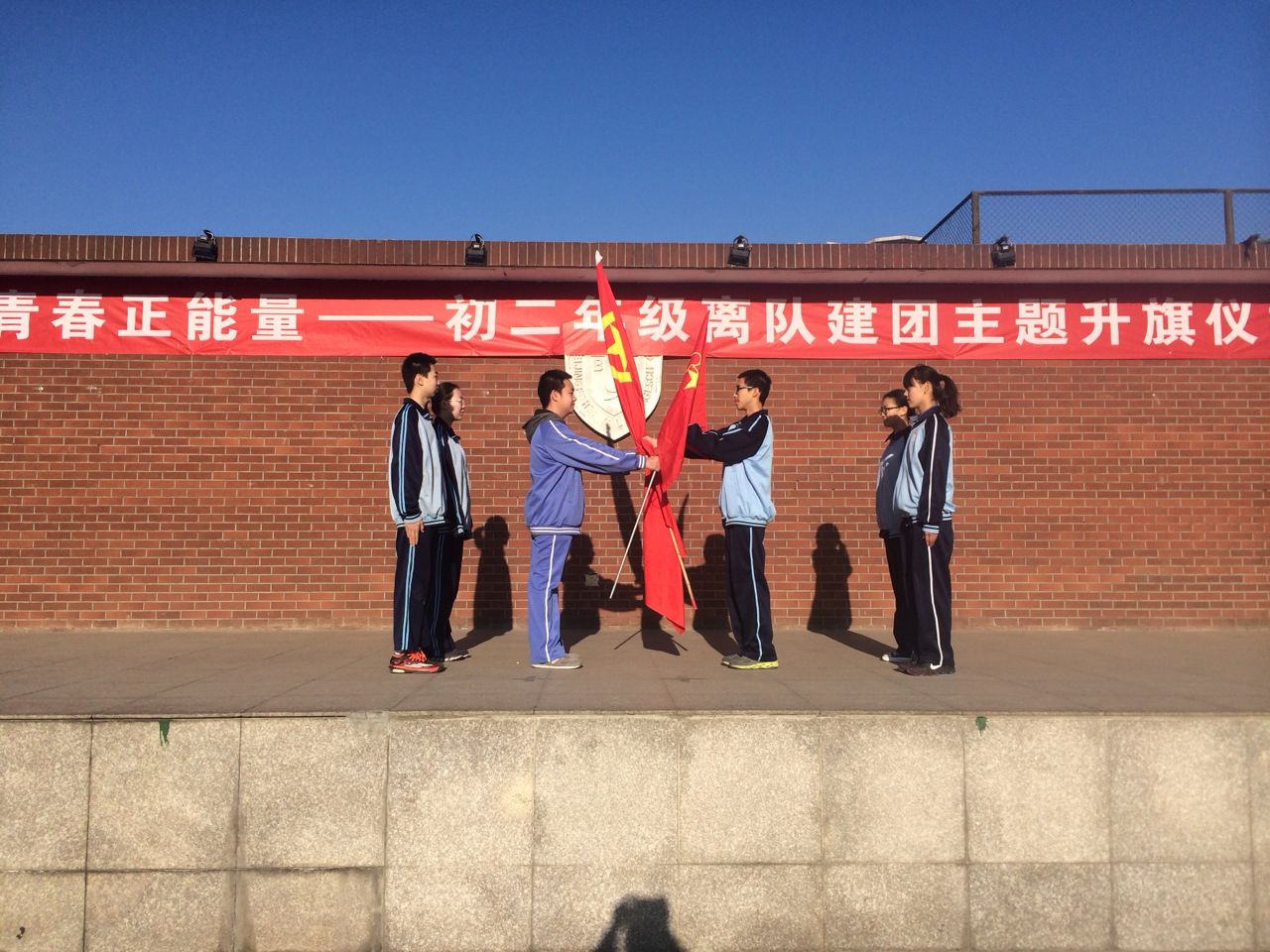 升旗仪式结束后,团委书记刘志欣主持初二年级离队建团活动。首先,校长助理、德育处主任杨磊宣读了《关于批准初二年级建团的决议》,并公布了新一届初中团总支委员名单。常务副校长王彤,副校长、副书记高雁鸣为新一任初中团总支委员颁发了任命书和聘书。校团委副书记、高二年级黄飞越同学和上任初中团总支委员将团旗传递给了初二年级团支部,标志着初二年级告别少先队,正式成为了团组织的一员。