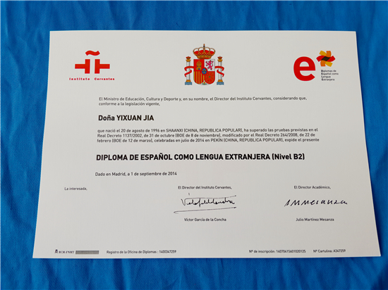 3月17日,塞万提斯学院为我校高三贾翼瑄同学颁发了DELE考试B2等级证书。贾翼瑄同学已取得免预科进入西班牙国立大学学习的资格。