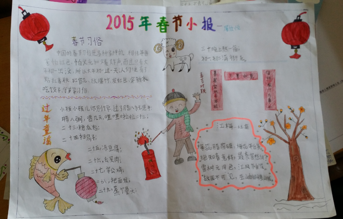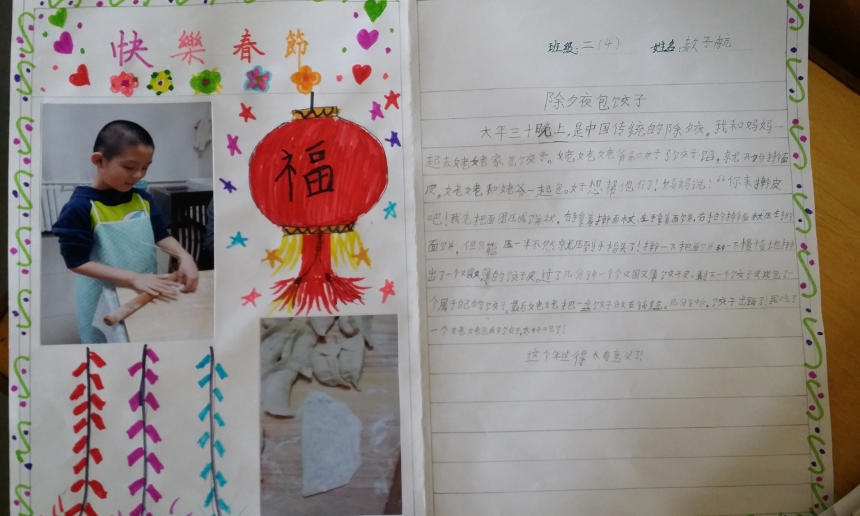 在寒假里,语文学科的内容为阅读经典书籍,关注中国传统文化。老师们鼓励学生观察身边的春节习俗,了解各地不同的风俗习惯,并以手抄报、配图写话、连环画等图文并茂的形式,展示自己的学习实践成果。即使是假期,老师们也不忘关注学生计算能力的培养。同学们上交的数学学科口算、计算训练作业,书写整洁,正确率高。英语学科以海报形式呈现了同学们丰富多彩的寒假活动以及欢天喜地过年的场景。从制作的海报中可以看出,同学们在欢度春节的过程中,认真观察、体会并记录,用所学的英文去表达自己的所见、所闻和所感。看到同学们的作品意图新颖、版面创新、内容丰富,老师们也仿佛感受到了他们充实而愉快的寒假生活。