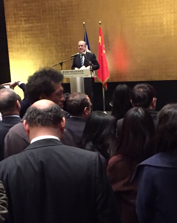2015年3月9日,我校校长助理、德育处主任杨磊和法语老师郭欣媛代表北外附校受邀出席了在法国驻华大使馆官邸举行的第二十届法语活动节开幕晚会。此次活动由法国、瑞士、塞内加尔、摩洛哥等法语国家驻华大使馆共同举办, 邀请到来自各领事馆、高校、中学、企业和媒体等机构的近百位代表参加。晚会上,法国驻华大使顾山先生充分肯定了法语在华的蓬勃发展,并且希望创造更多机会让说法语和学习法语的人去了解法国和认识法国。