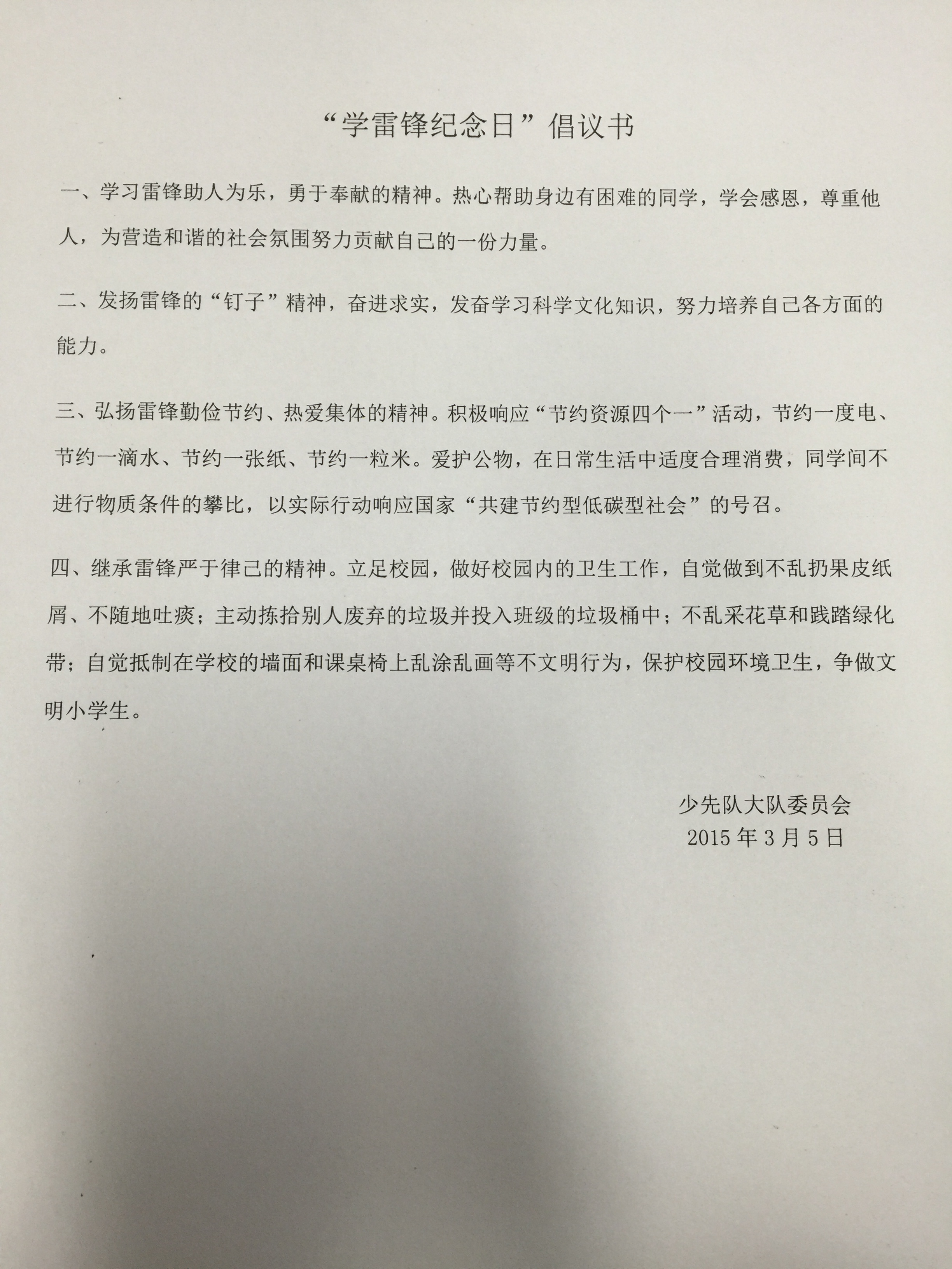 纪念雷锋的日子里,不能缺少队员们的参与;企盼爱心的目光里,不能缺少队员们的帮助。学习雷锋,一切从自己做起,从心做起,从小事做起。让少先队员们行动起来吧!迎着佳节的喜悦,在实践中加深对雷锋精神的认识,在校园中掀起自觉实践雷锋精神的热潮,使雷锋精神在我们的校园内发扬光大,传承不息。