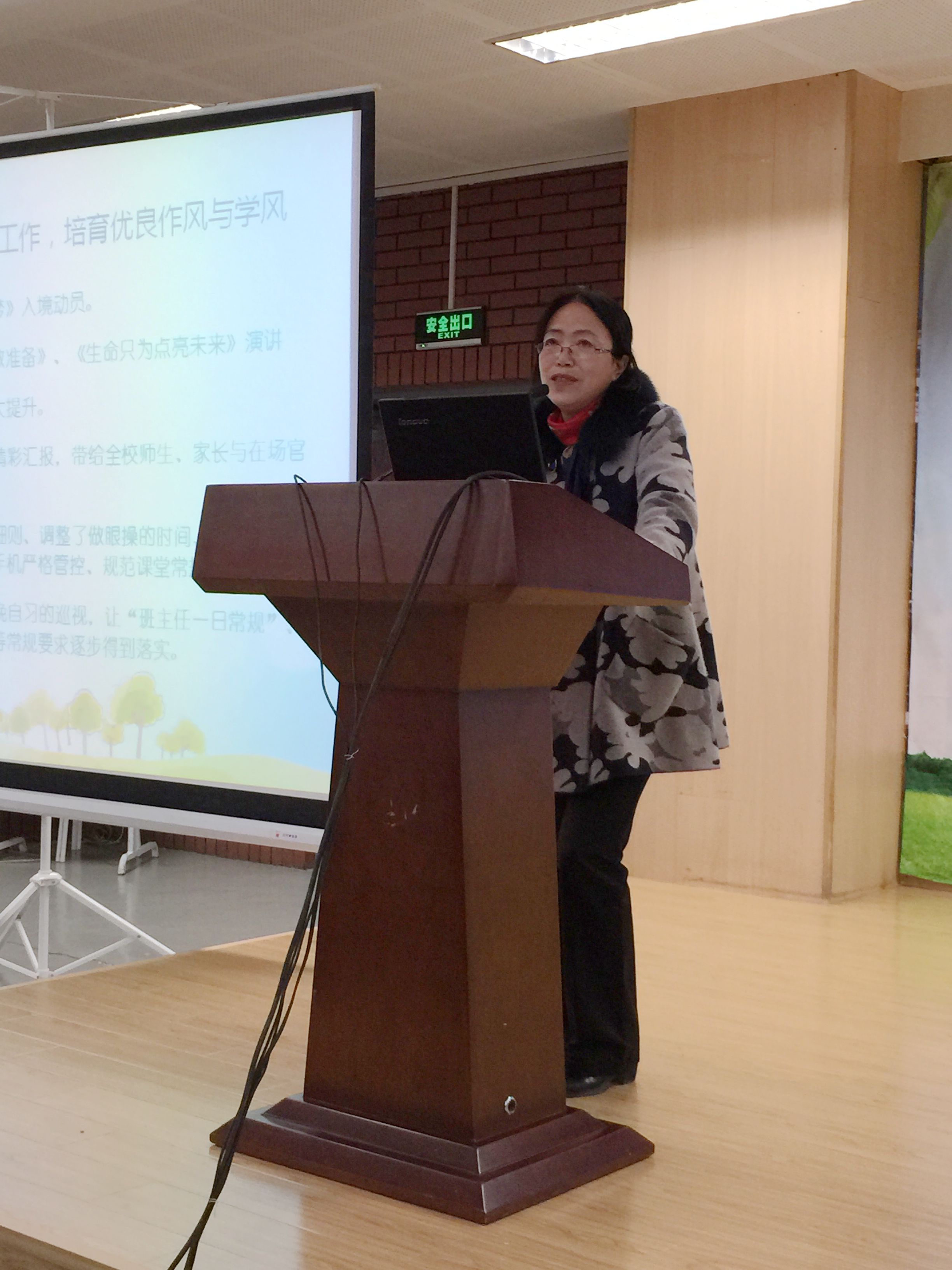 刘长虹首先做了题为《情怀 目标 实践 思考》的高中德育工作总结,对上学期德育工作在培养优良作风、学风,培养“班主任思维”,班级年级文化建设,树典型弘扬正能量,打造精品,常规管理数据几个方面做了展示和说明。刘长虹认真分析了上学期各班级常规管理考核数据带给教师们的一系列思考后,解读了《2014——2015学年第二学期德育工作计划》:提高班级常规管理标准和质量,推动“中国梦、我的梦”实践与实施计划;继续丰富“活动德育”的内涵和形式,推进“外交礼仪育人”的德育特色建设;继续广泛深入开展“四自教育”,为学生自觉约束和自主管理搭建舞台;继续开展班级文化和年级文化建设,创建美丽校园和美丽中国;继续完善德育工作机制,着力学科德育建设,推动全员德育落实;德育窗口重点工作。刘长虹对本学期工作重点做了题为《具体举措的落实——新学期德育常规管理中我们的思考与路径》的解读,。她把教育理论和名家名言,渗透到班级德育常规管理中,对班主任工作计划提出了具体要求,拟定了班级工作《具体工作日程表》。