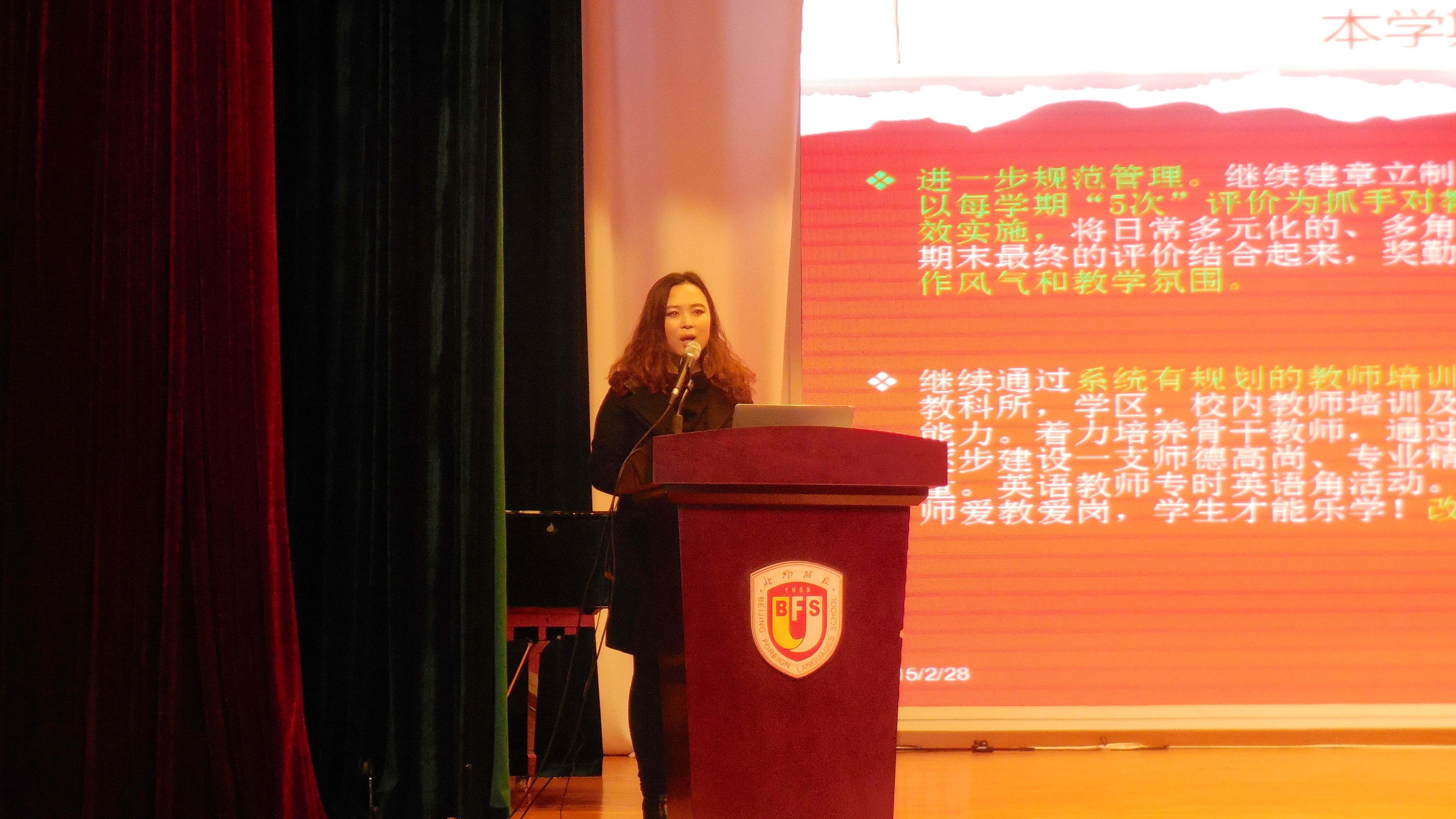 郭丽丽解读新学期小学教学教研工作计划并对本学期教育教学目标、教研活动、教师培训、学科特色活动、创新学生学业检测方式等十一项重点教学教研相关工作进行了详细讲解和部署。她指出,我校小学教学工作要以学校整体工作思路为指导,以“保护学生学习兴趣,提高学生学业成就”为教学工作重点,在“基础教育国际化”课题研究基础上,各学科注重培养学生的国际视野、创造力、想象力、批判性思维及合作意识。各教研组制定切实可行的目标,创新教学及评价方法,让孩子们可以“玩着学”,让每个孩子在获得学业进步的同时享受快乐学习的过程和成就感。以系统有规划的教育科研引领教师队伍,以赛带研,以研促教,促进教师专业发展。开展丰富多彩有教育意义的学科活动,激发学生兴趣,全面提升学生的学科素养,让学生通过活动体验生活,互动合作,锻炼其参与实践、与人交往协作的能力,解决问题的能力及体验丰富的校园文化生活。郭丽丽对计划中的重点工作作了具体布置,同时又详细解读了针对本学期教学工作的八项具体措施,她希望各组在详细规划的前提下,新学期的工作能在从容、高效、愉快的状态开始并进行到底。