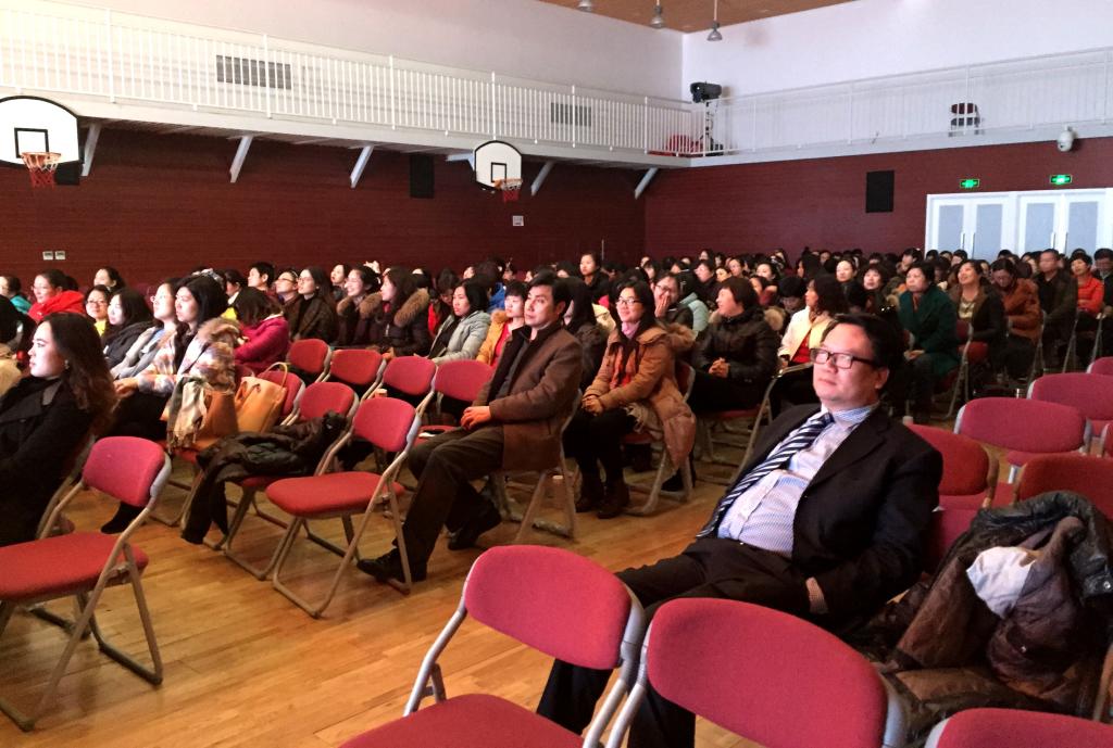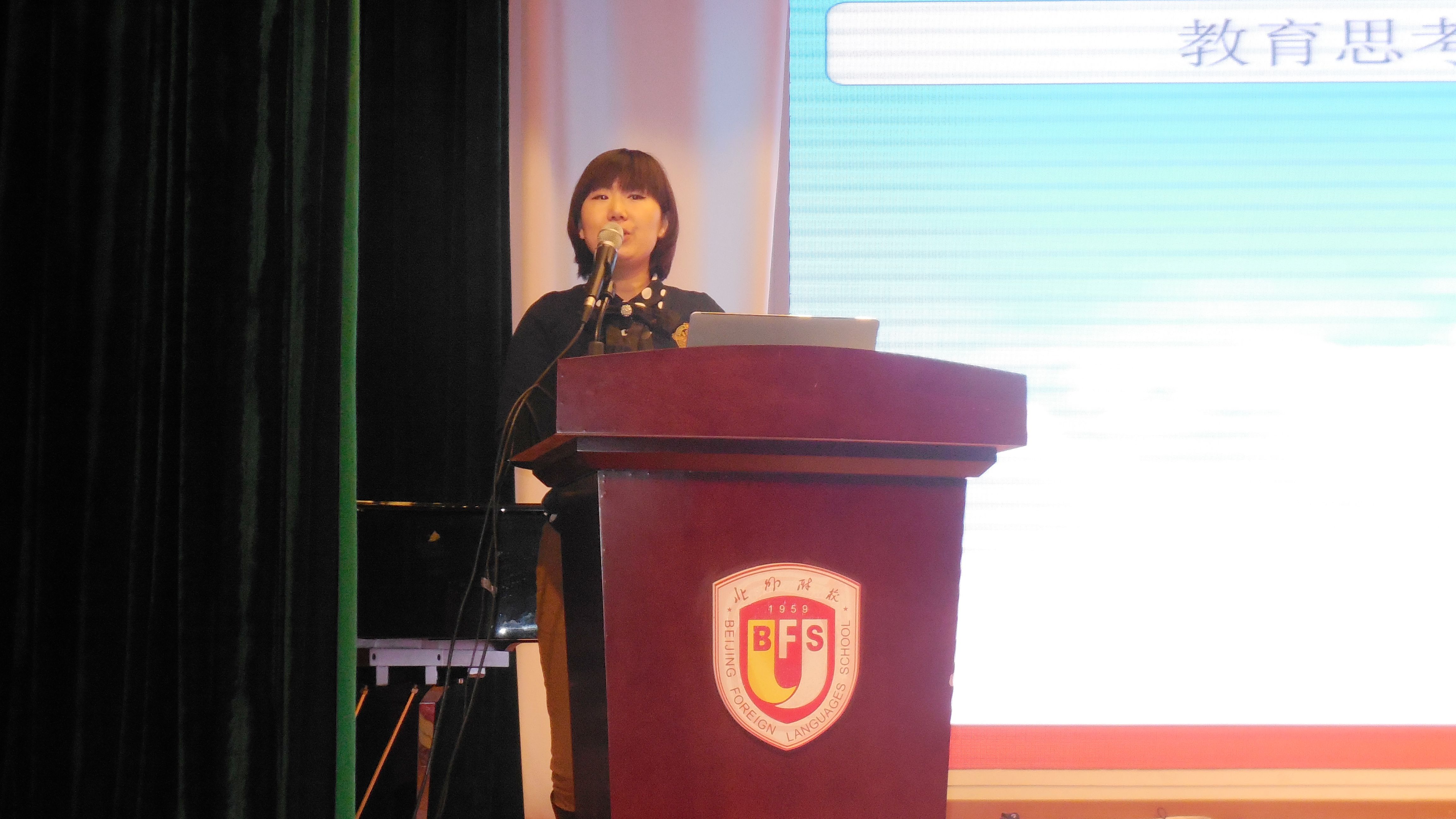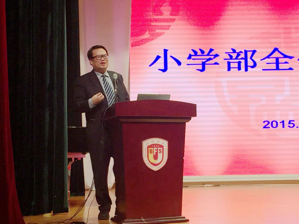 贾志庭分享了她对于“学校是什么?”问题的个人理解。她认为校园就是一个微型社会,在这个模拟的“比如世界里” ,孩子通过和同学、老师相处完善人际交往能力;通过每天的衣、食、住、行形成基本的生活技能和礼仪;在与知识的碰撞中形成探索和思考的学习能力;在与校园的一桌一椅、一草一木的相处中学会关注自然,爱护环境;通过适应学校制度形成遵守公共秩序和制度的意识。德育工作的中心就是关注学生个体及群体的生活体验,抓住关键“事件”,开展促成对其人生有益变化的教育。接着她以“站在未来的视角看待今天的教育”为题,展开了对本学期学校德育工作的详细解读。她分别从德育队伍现状、工作重点、具体措施、工作行事历四个方面进行阐述,强调小学的德育工作重点要落实在常规、礼仪及习惯养成等方面,要求各全体教师在学校德育工作思路和小学部德育工作计划的总体框架下,认真思考年级、班级的人性化特色管理。同时强调德育活动要落到实处,避免形式化。今年德育推出了“班级维权小队”、“微电影,大视角”的文明礼仪特色活动,引导孩子以主人翁的态度对待每天的生活,并且通过自己的视角关注周围环境和自身的成长。贾校长提出,教师守护的是孩子们最富有朝气和活力的一段生命历程,每位教师都要以“爱”为一切工作的出发点,把学校建设成爱生校园。