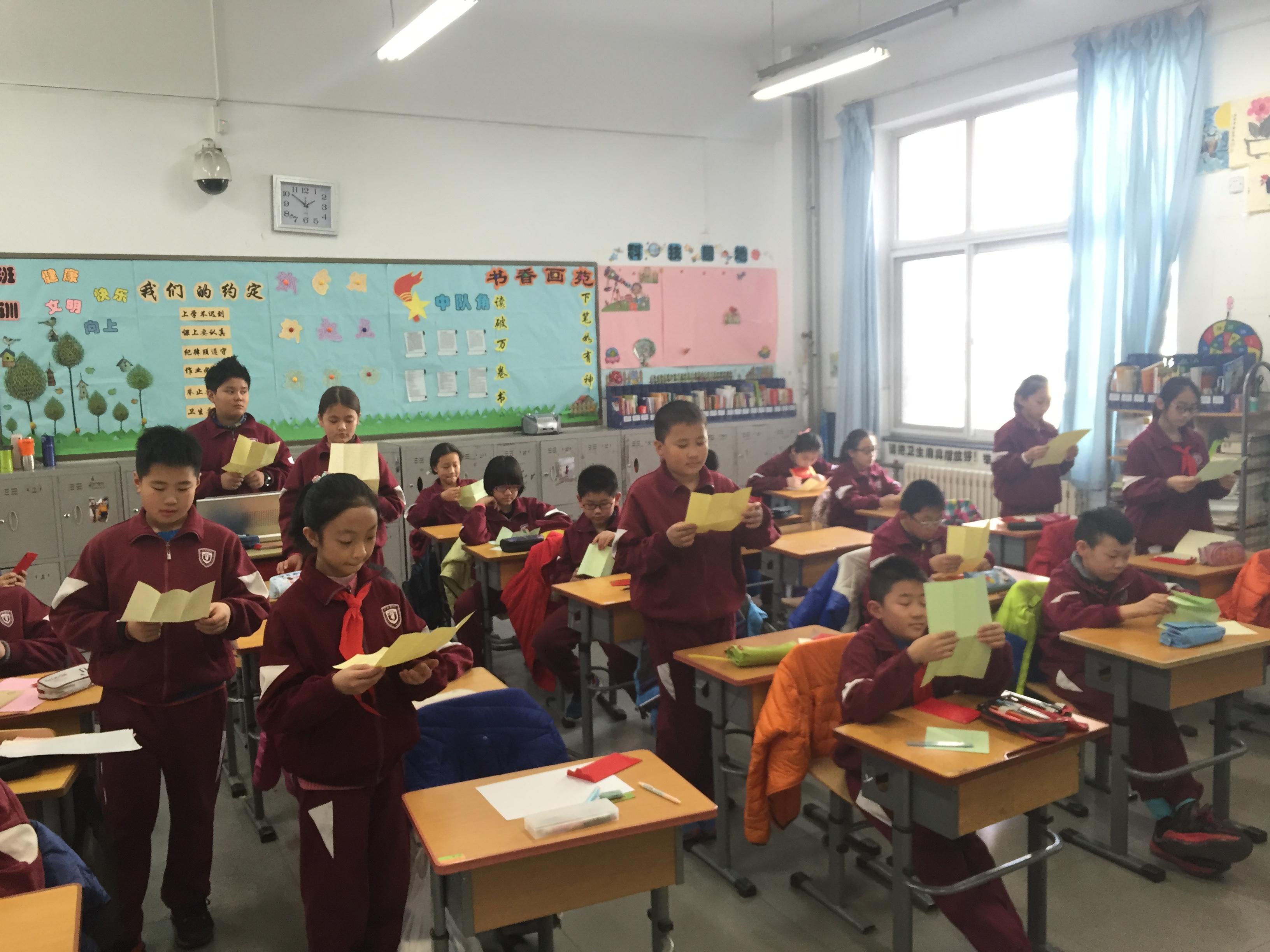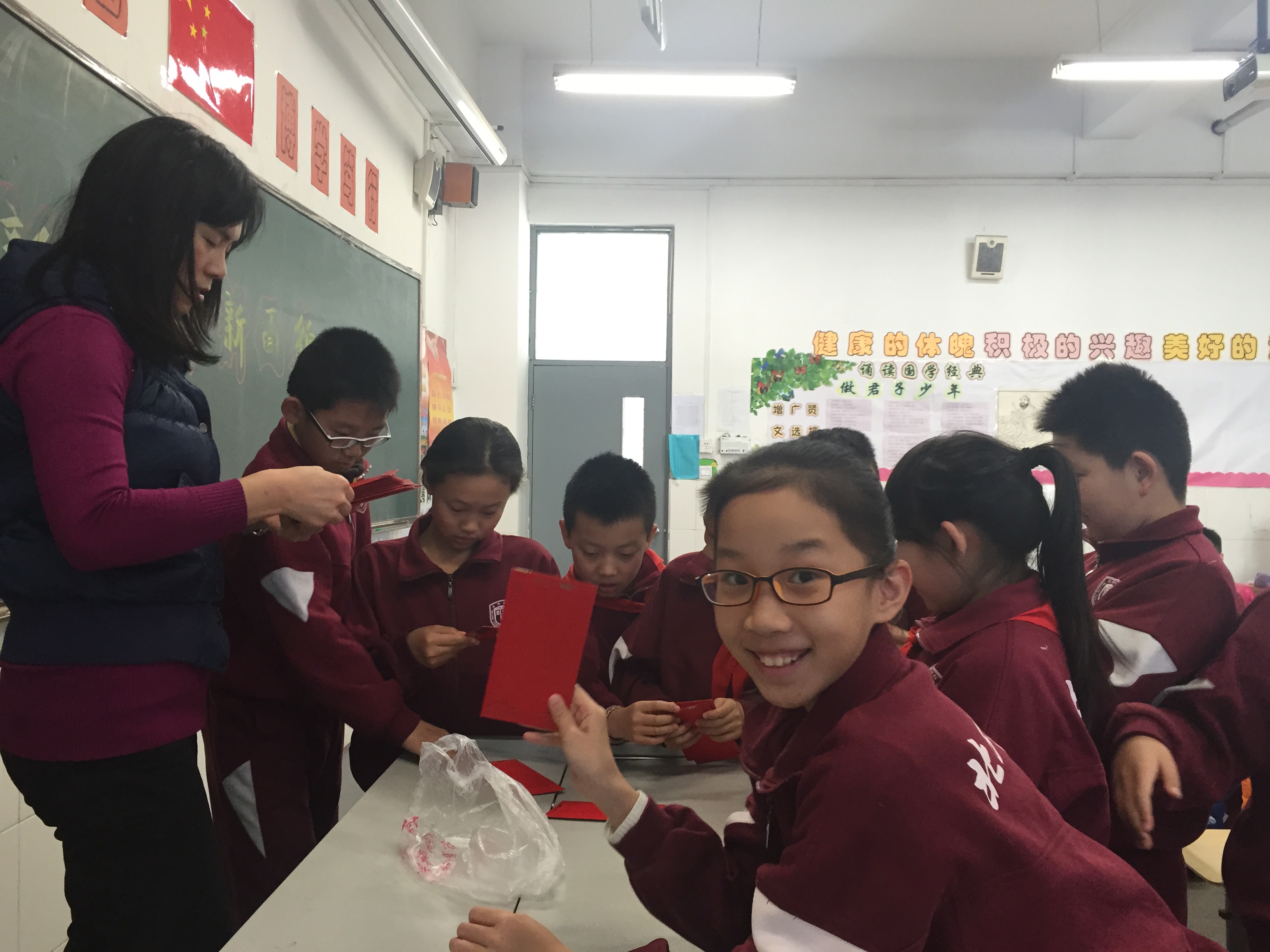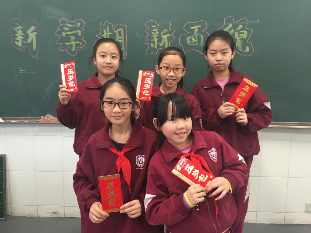 五年级(1)班徐知珩同学拿到红包,笑着对老师说:“今年过年,我一个红包也没有收到。开学了,收到老师给的红包,很开心!就像收到了过年的压岁钱一样,今后一定会按照红包里的要求做一个好学生,谢谢老师!”