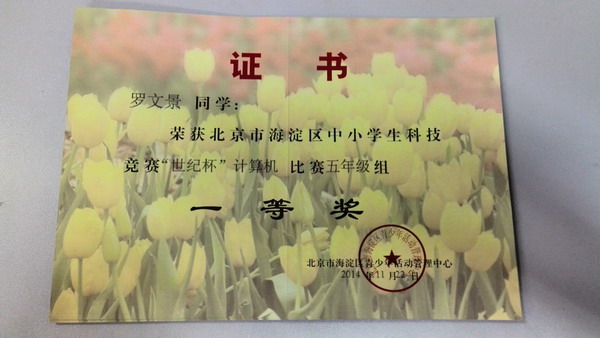 罗景文 “世纪杯”计算机比赛五年级组 一等奖