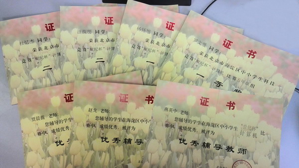 11月22日,海淀区中小学生“世纪杯”计算机竞赛在北京师范大学举行,我校参赛学生喜获佳绩,其中一等奖2名,二等奖2名,燕英中、赵龙、贾晨薇3位老师获得“优秀辅导教师”称号。