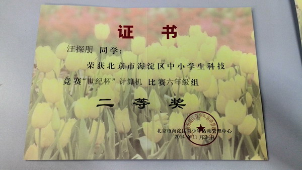 汪探朋 “世纪杯”计算机比赛六年级组 二等奖
