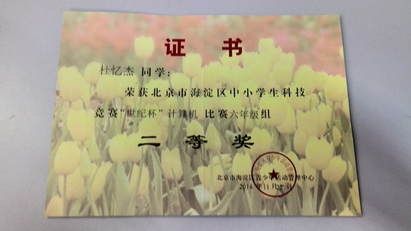 杜忆杰 “世纪杯”计算机比赛六年级组 二等奖