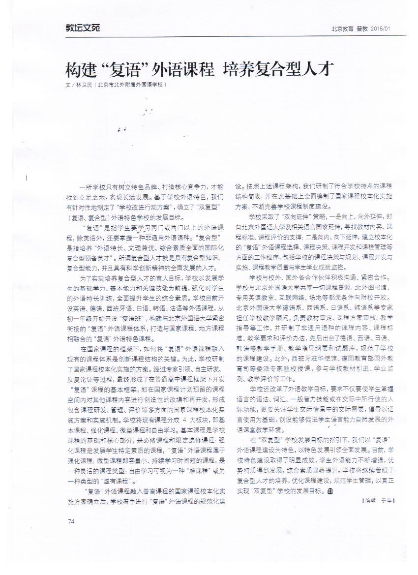 近日,《北京教育》杂志2015年第1期全文刊登我校校长林卫民文章——《构建“复语”外语课程 培养复合型人才》。