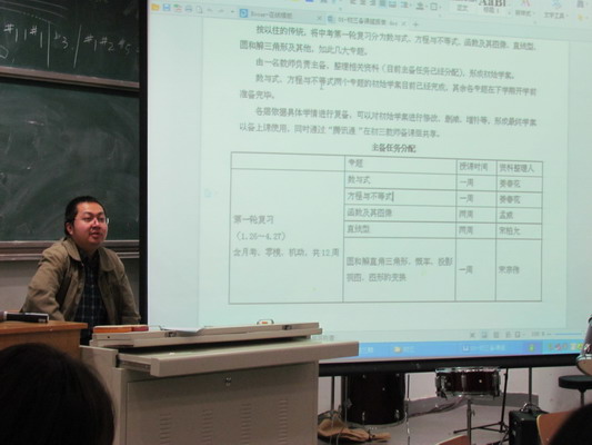 备课组长宋柏允老师介绍了初三年级期末复习计划,主要内容包括:前期资料准备,近三年期末及一、二模资料的整理任务表的具体安排,不同水平的学生复习时间的规划。宋老师呈现出备课组内中考第一轮的复习计划,他分别从主备任务分配、周测的设置、考试的统一安排等几个方面体现组内复习原则和必要流程。最后,宋老师结合他所教班级不同水平学生的特点及定位整理出期末复习内容,具体到每一天每一课时的重点复习内容,并将自己的一节《二次方程复习课》教学案例展示给在场的老师们。