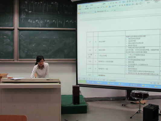 宋宗伟老师和姜春花老师分别介绍中等及偏下水平的班级学生特点及期末复习计划,具体到每天每课时的详细内容,其中包括:重点落实的内容,对学生的作业及要求。宋宗伟老师展示了一节关于锐角三角函数的复习课例,在课例中,宋老师把解直角三角形抽象出来,分成15类小题目,一是加强学生对解直角三角形的熟练度;二是对解直角三角形进行了一个系统的分类。姜春花老师在锐角三角函数复习的过程中注重基础知识的落实,对核心知识点进行当堂检测当堂反馈,并能快速和准确地提炼出学生的出错点,诊断出错误的共性,及时讲解。