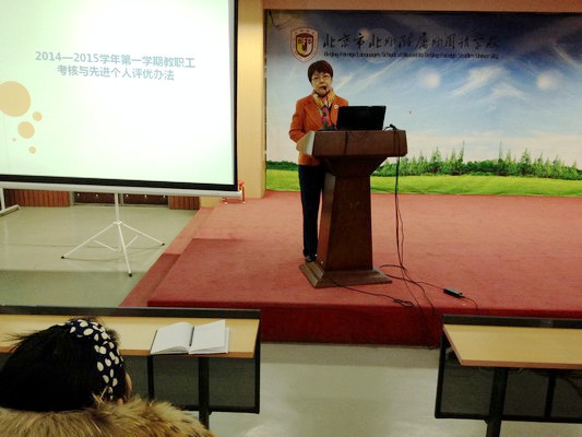 王静为大家解读《2014—2015学年第一学期教职工考核与先进个人评优办法》:评优条款注重教师德、能、勤、绩的全面体现;评优项目多,涵盖面广,人数比率高;评优目的是让品德好、责任心强、教学业绩优秀的老师脱颖而出,以真正做到评优的激励作用。之后,她对学部和年级评优工作做了具体布置,又对会考工作和期末考试工作的各项事宜进行具体安排。
