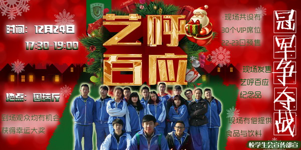北外附校一年一度属于学生的节日:“艺”呼百应总决赛将在圣诞夜与您面!我们从报名的100多组节目中,经过初赛、复赛最终筛选出六组最受学生欢迎的选手和组合,节目中还会有特邀嘉宾前来助阵,真的值得期待!届时还会有更多惊喜等待着您!