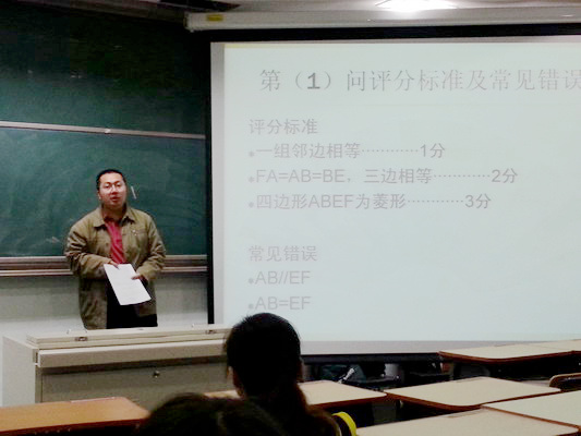 12月9日下午,我校初中数学教研组在录课室组织开展关于中考阅卷经验交流学习活动。活动由教研组长孟威老师主持,由参加2014年中考阅卷的孟威老师和宋柏允老师主讲。