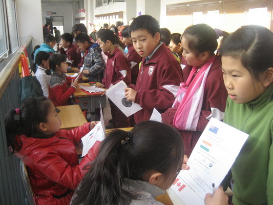 下午1:30英语游园会活动正式拉开了帷幕。全体四年级学生都积极参与到活动中来,学生们轮流充当考官,暂时没有担任考官职责的学生则到各个展区参观并回答考官提出的问题,能够准确地利用英语回答与该展区国家有关的三个问题的学生,可在自制的简易护照加盖签证章一枚。