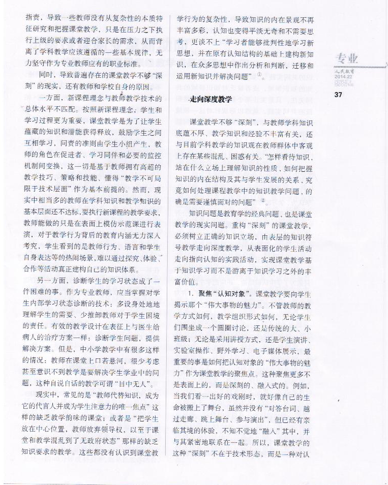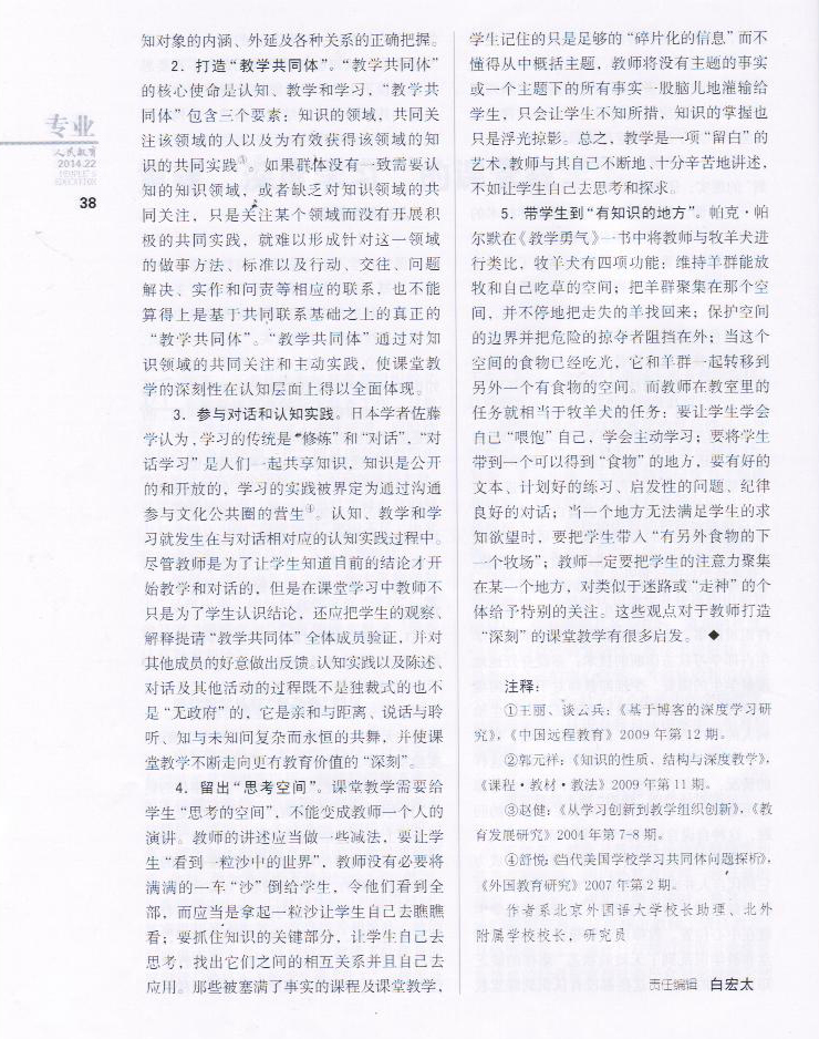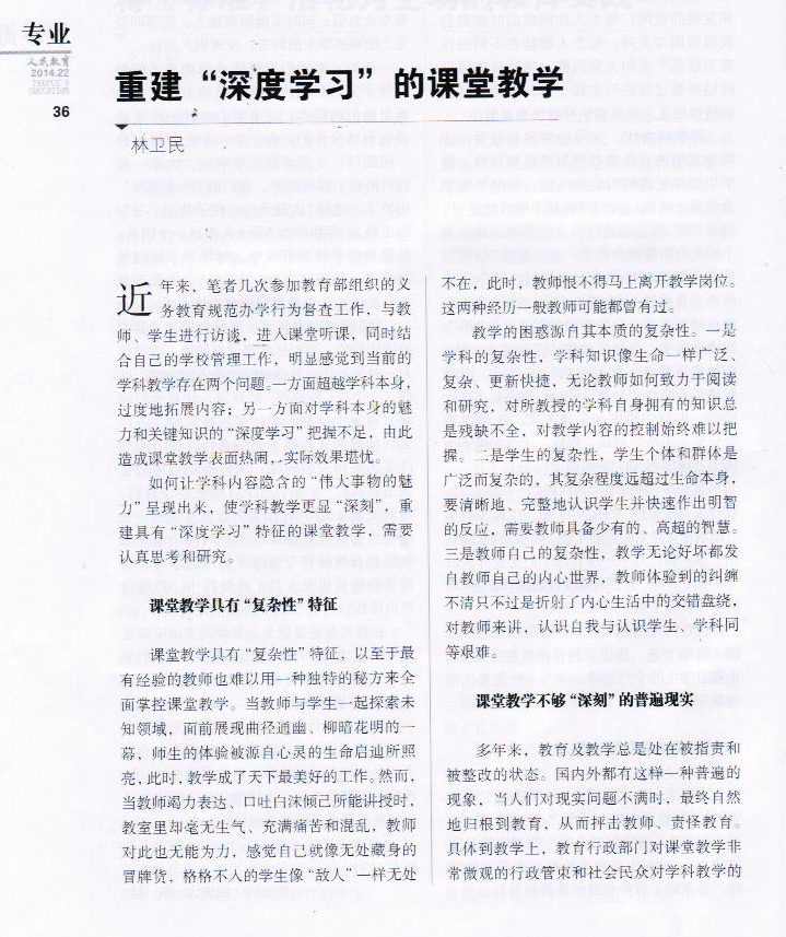 近日,《人民教育》杂志2014年第22期全文刊登我校校长林卫民文章——《重建“深度学习”的课堂教学》。这是2014年度《人民教育》杂志第二次全文刊发林卫民校长的文章。