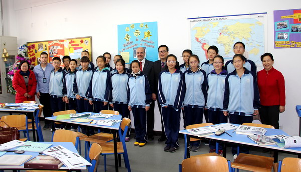 常务副校长王彤博士详细介绍了我校发展历史、高中复语班的师资配备及升学情况,西语教师张琳丰介绍了我校西语教学发展、教师来源及生源变化等情况。我校高中西语班学生孙艺雪、李馨雨用西语介绍了自己学习西班牙语的感受,她们的西语水平受到参赞一行的充分肯定。